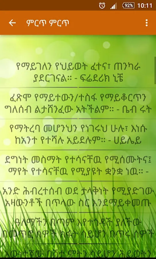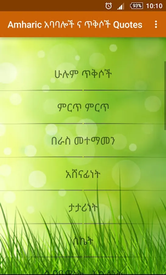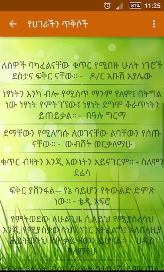 አፕሊኬሽኑ የተመረጡ ከ250 በላይ ጥቅሶችን በ20 መደብ ከፋፍሎ ይዟል። እነዚህም፤ በራስ መተማመን ፣ አሸናፊነት ፣ ታታሪነት ፣ ስኬት ፣ ሰብዓዊነት - እኩልነት ፣ አስገራሚና አዝናኝ ፣ የሀገራችን ጥቅሶች ፣ አበው ፣ አመለካከት ፣ ስብዕና ፣ አነቃቂ ፣ ለዉጥ ፣ ቆራጥነት ፣ ዓላማ ፣ ወድቆ መነሳት ፣ ሌሎች ፣ የሀገሮች አባባል ናቸው።