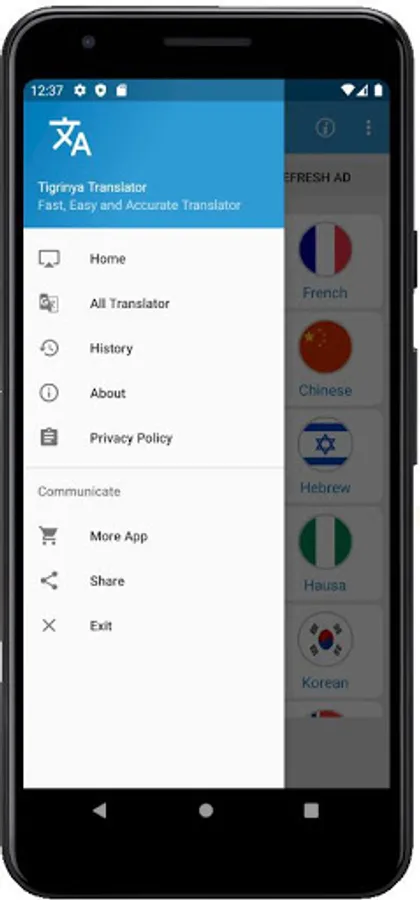 This Tigrinya to English translator application translates. It translates English, to German, to French to Tigrinya and between the languages.