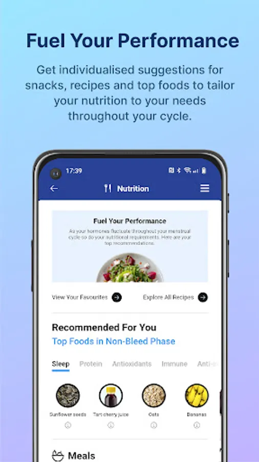 • Browse an expansive library of healthy snack and meal recipes with advanced search and filtering to zero in on what’s right for you. Save your favorites for each phase of your cycle.