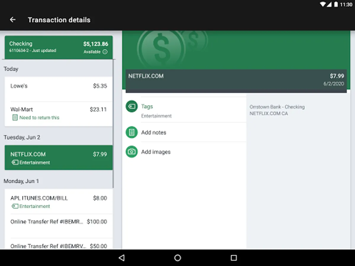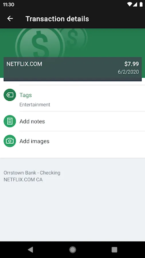 Add Tags, Notes, Images & Geo-Information: By enhancing transactions with custom tags, notes or photos of a receipt or check, you have the ability to stay organized and find exactly what you’re looking for when searching through your finances.