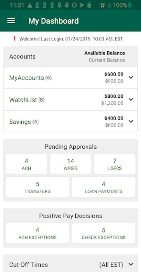 o Review and decision potential fraudulent transactions (Check and ACH Positive Pay)