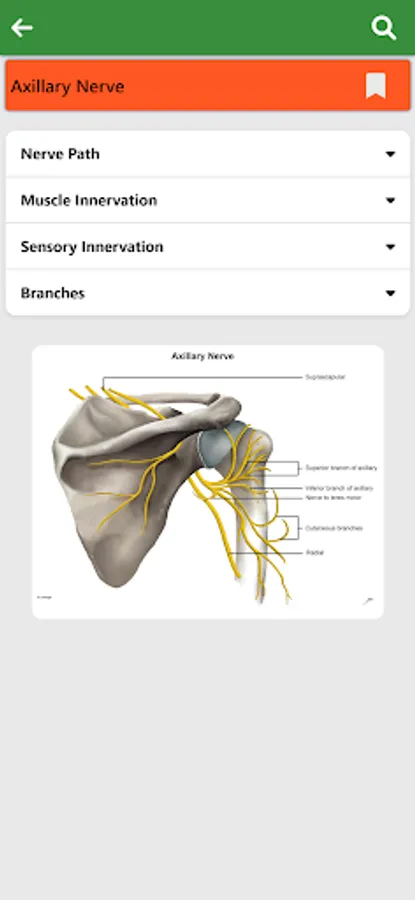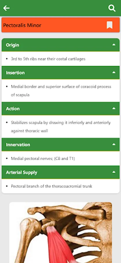 It's organized into upper extremity and lower extremity regions in addition to nerves of the upper and lower extremity, and each region is divided into the muscles of that region. Each muscle is explained as: the origin of the muscle, the insertion, the action, innervation and blood supply of the muscle. And each muscle section contains a simple image of it.