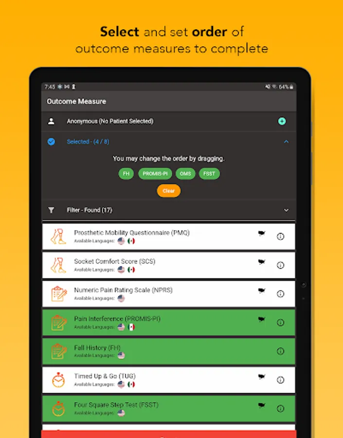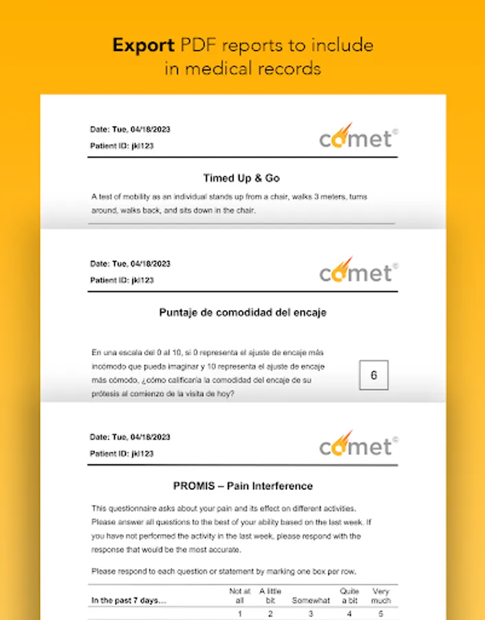 The Clinical Outcome Measures Electronic Toolkit (COMET) provides a library of fifteen useful clinical outcome measures for prosthesis and orthosis (P&O) users and clinicians. COMET simplifies and standardizes the use of outcome measures for daily clinical practice by enabling practitioners to easily select the appropriate measure, administer the test(s), and immediately receive the results as a printable/exportable PDF document to inform evidence-based clinical care and to be included in the patient’s electronic health record.
