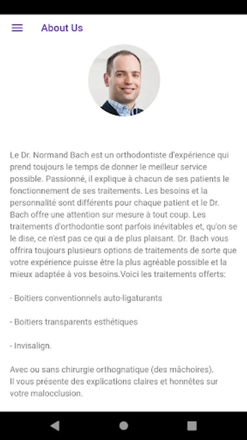 Cette application est un outil indispensable pour les patients actuels et les futurs patients de Dr Normand Bach, orthodontiste à Montréal. Elle est utile tant pour communiquer directement et efficacement avec lui que pour lui envoyer les photos afin qu’il vous donne son opinion SANS FRAIS sur la durée, le coût et le type de broches que vous pouvez avoir ou si vous êtes éligibles à un traitement par gouttières transparentes Invisalign.
