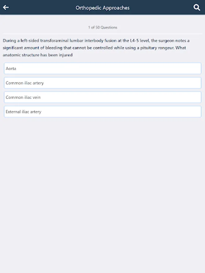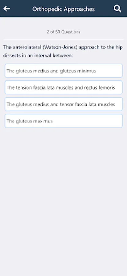 There is also a MCQs quiz test for orthopedic surgical approaches that contains almost 200 MCQs, the total MCQs in a single quiz are 50 MCQs.