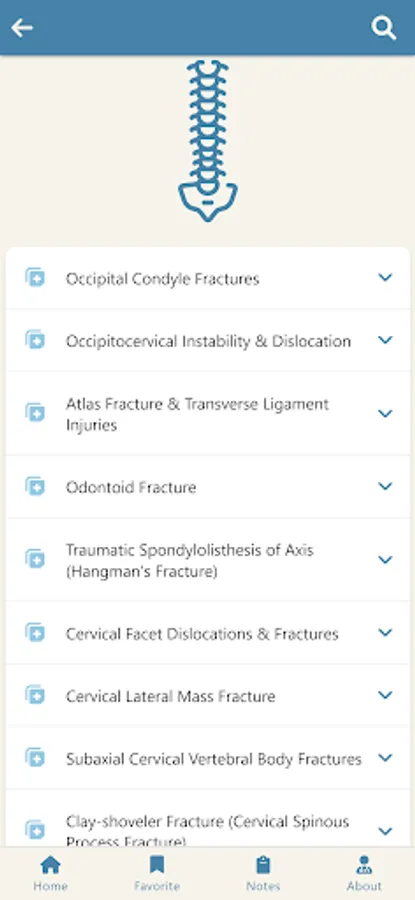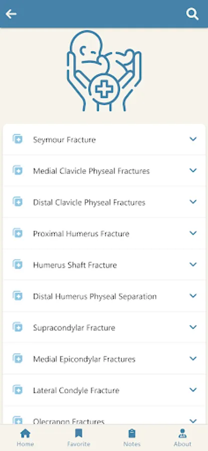 The Orthopedic Indications app contains many clinical cases and fractures distributed according to the region and the nature of the disease.