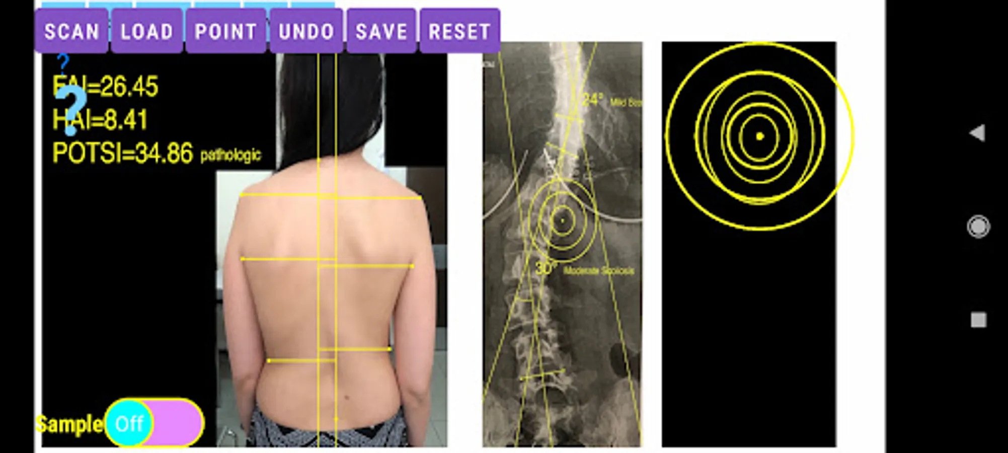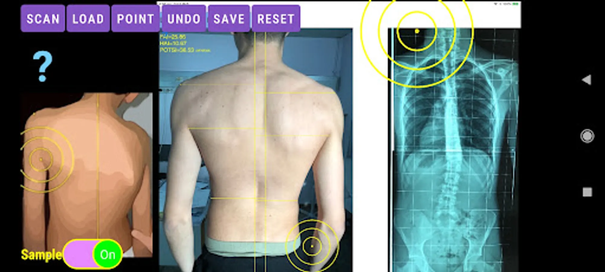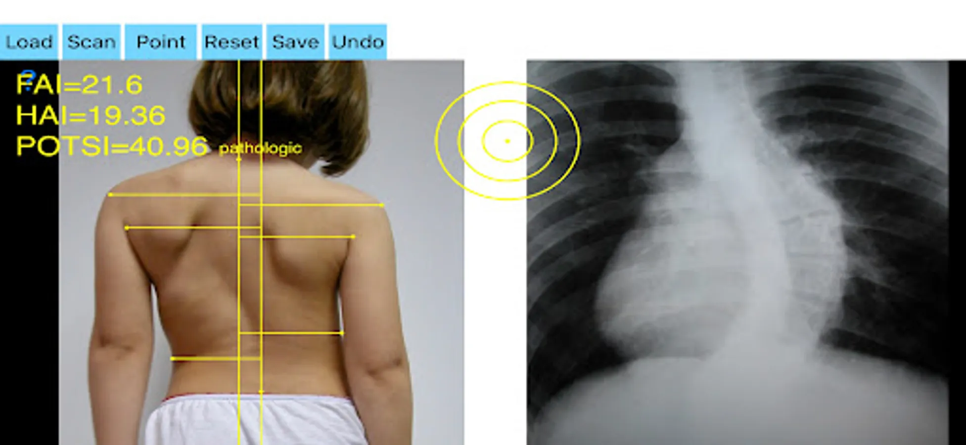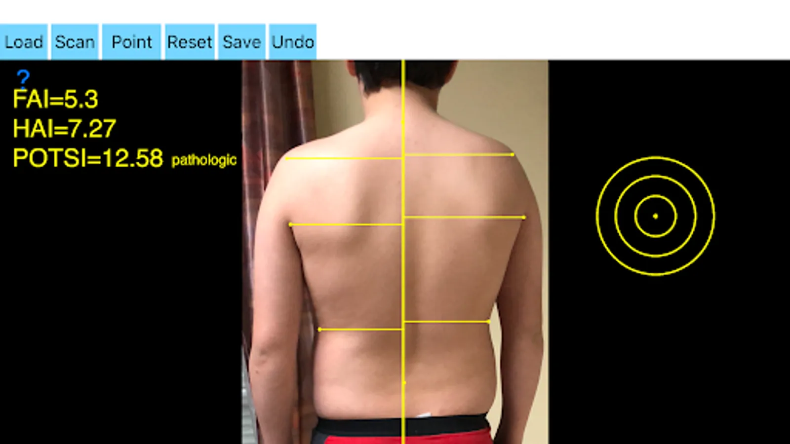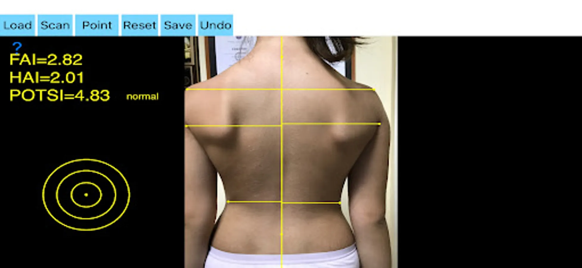 -by marking certain multiple anatomical points over the patients back the app can evaluate back’s symmetry in a few seconds. Eight specific points at the surface of the patient’s back are required. POTSI is relatively simple to measure, even on regular photography of the back. Ideal POTSI is zero, meaning full symmetry of the back surface. The App calculates all necessary elaborate formulas and after analysis the posterior trunk symmetry index (POTSI) is printed (normal value <10).