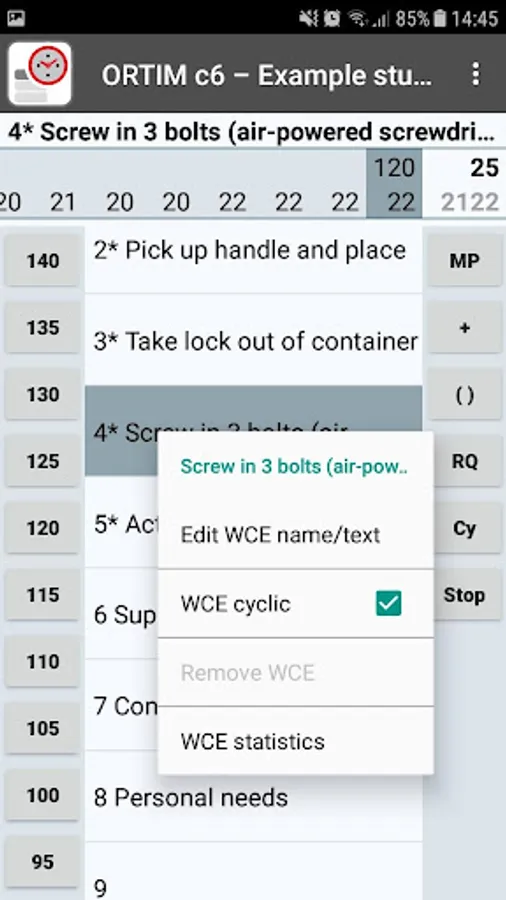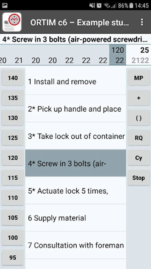 Using proven measuring methodology, times are recorded and, by means of direct access keys, performance ratings are assigned to the measured values, reference quantities defined and outliers and interruptions highlighted. What is more, the work cycle elements concerned can be described, re-added or removed. There is no limit to the number of studies.