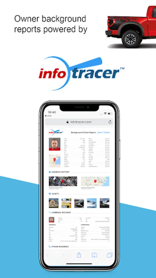 - Owner information, traffic court records and criminal driving violations provided by Info Tracer. (extra cost).