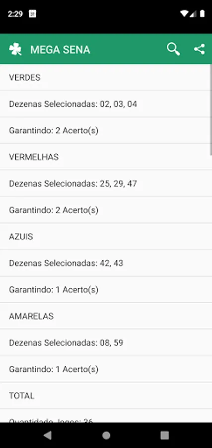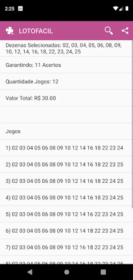 For example, if you select the Lotofácil lottery game and put it to break up 17 tens guaranteeing 11 hits, the app will generate 22 games. But what does it mean? The app will guarantee you a minimum of 11 hits out of 17 numbers. Assuming that 11 dozen are matched with those chosen. You will be sure that you have won at least 11 hits.