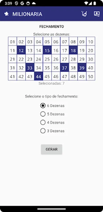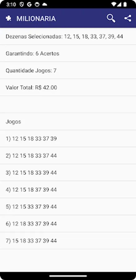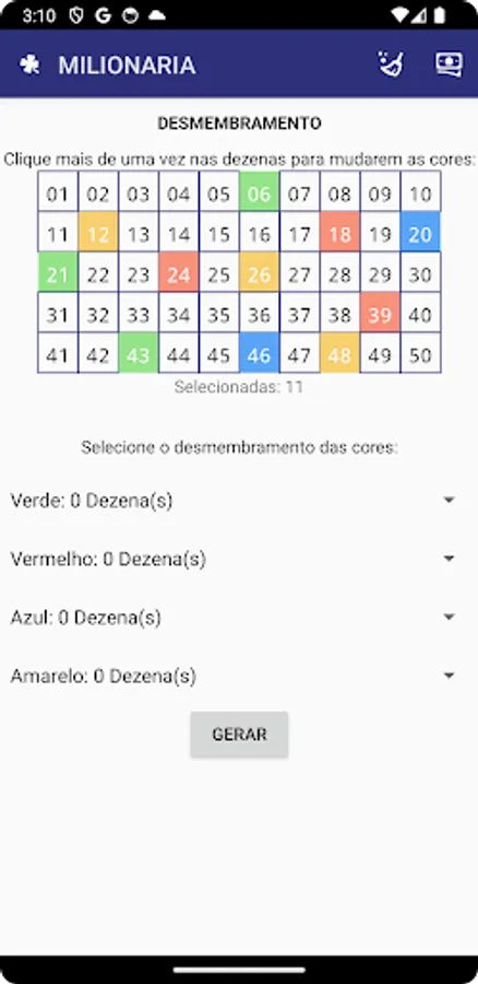 Make Millionaire break-ups with this app. With the free version you will be able to dismember up to 8 dozens of the millionaire for free. The application will provide you with a guarantee of success if you bet on lotteries throughout Brazil.