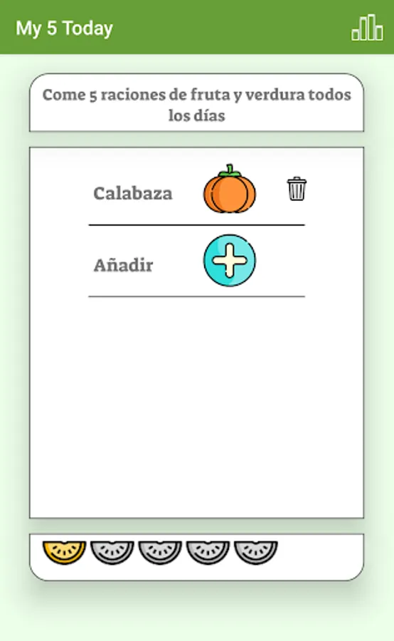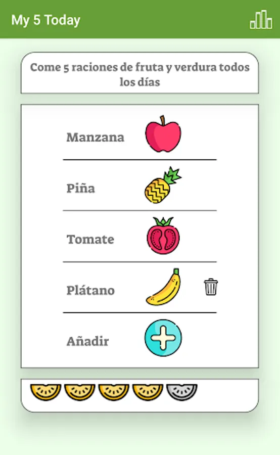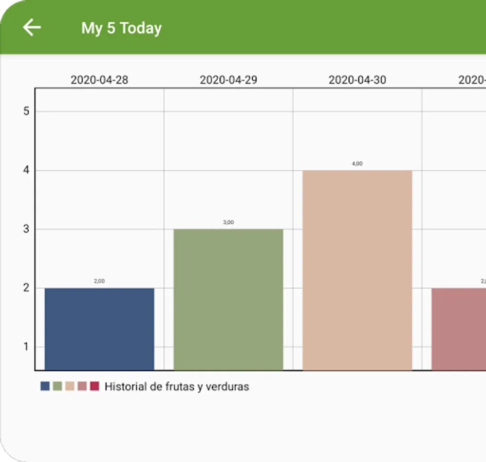 We help you improve your healthy lifestyle habits by keeping track of the fruits and vegetables you have consumed during the day, and looking at what you have left to reach the 5 servings they recommend per day.