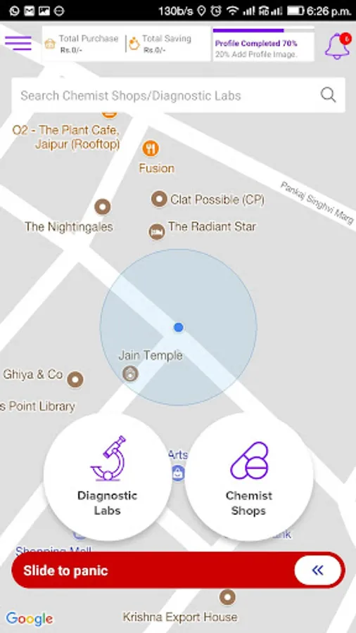 Mobile application provides information about locally placed diagnostic labs and medicine shop in nearby area. It directly connects user with shops or labs and gives competitive prices, so that maximum benefits to the user can be assured. Its user friendly and to avail the benefits user required to upload the prescription. All benefits of direct dealing can be availed such as immediate delivery, instruction, replacements, alternate options etc. with attraction at discounted price. It’s a real gain in pain. It also keeps your medical records. You can earn lucky coins by sharing it among your contacts which can be redeemed against payment. Ensure speedy rescue in critical situation. This app have a unique feature that is Panic button. it is security feature.