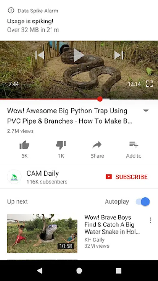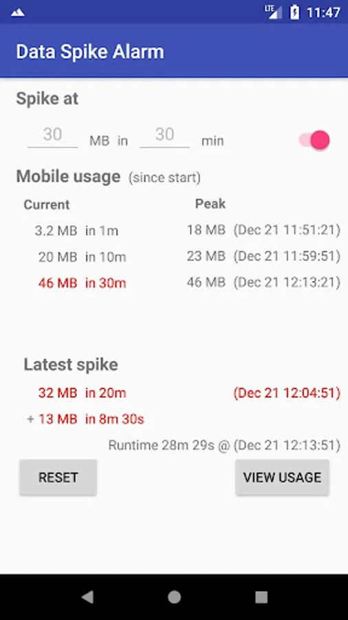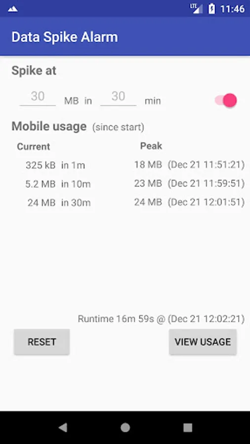 Detect spikes early with a custom alarm - pick your own "normal" usage and time window (ex. 30MB in 30 min, 100MB in 24hr), and an "always on" monitor will keep guard for you. No ads, no permissions (and no promises on being "pretty").