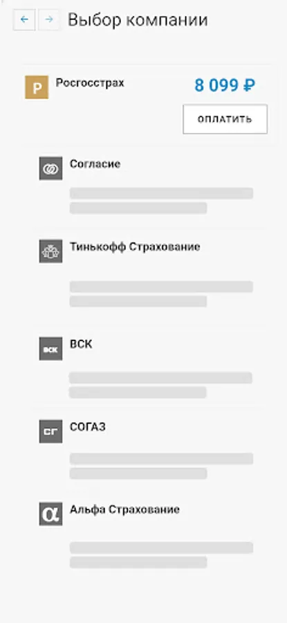 The request is sent automatically to 16 insurance companies (AlfaStrakhovanie, Ingosstrakh, Rosgosstrakh, Consent, Zetta Insurance, RESO, VSK, Renaissance Insurance, Tinkoff Insurance, MAKS, Absolute Insurance, EUROINS, OSK, Astro-Volga, SOGAZ, Yugoria, Intach)
