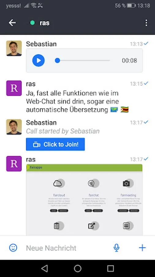 fairkom is an official Rocket.Chat partner and offers customization or integrations. Talk to us, if you would like to see more features or need your own app: sales@fairkom.eu