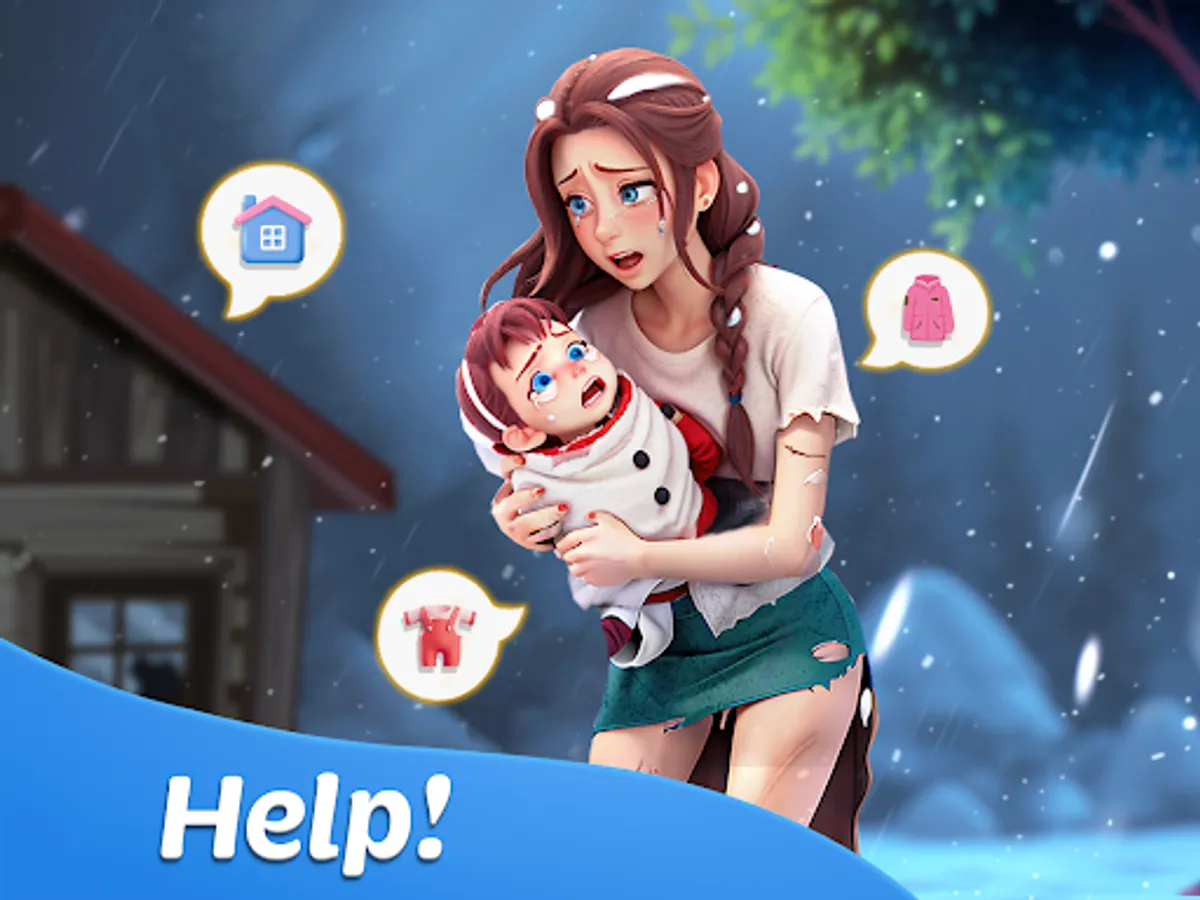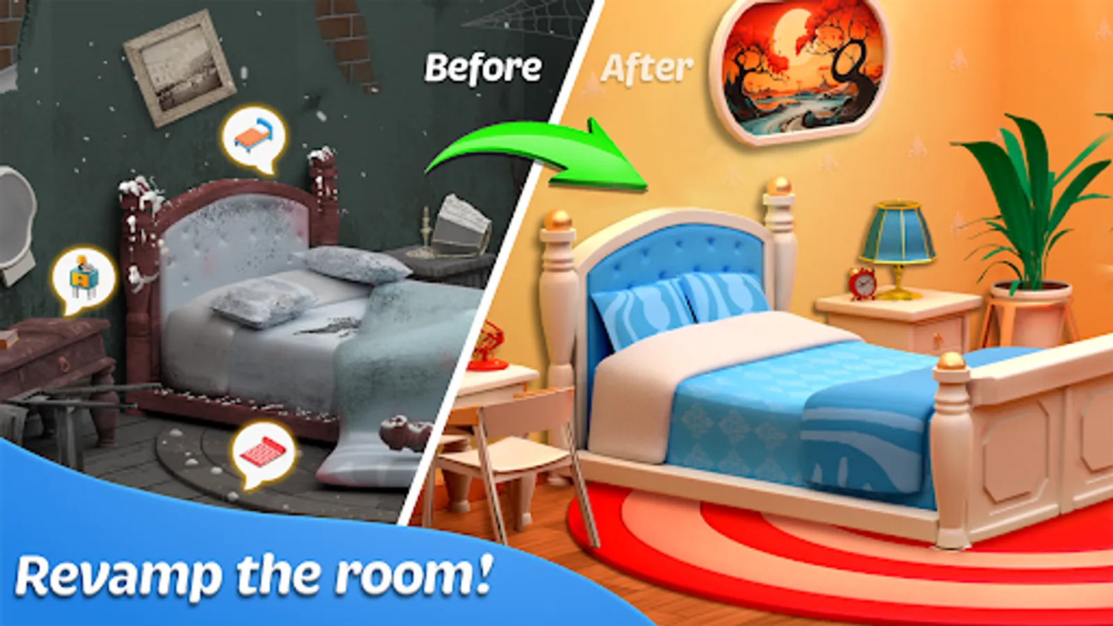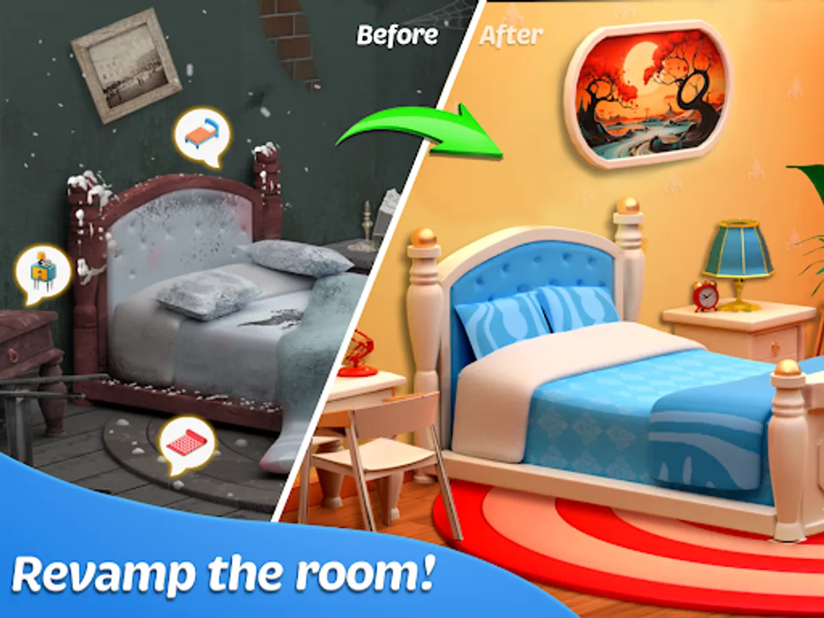 Renovate the abandoned mansion from neglected to beautiful with earned coins to help the mother