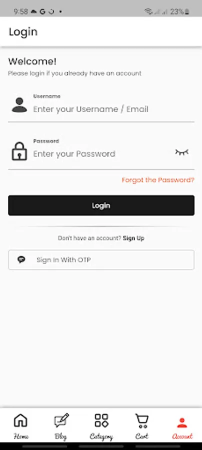 4- Log in with either your phone number or your e-mail address and the password that you registered to create the account