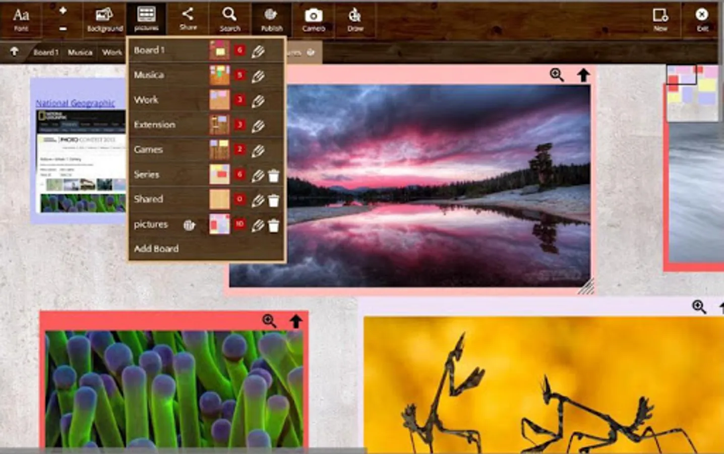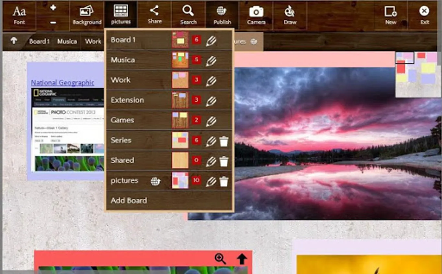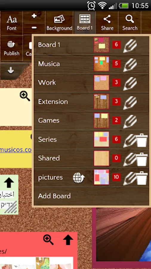 Multiple boards: organize notes in boards, use textures to change the look of the board, move notes between boards.