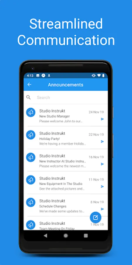 Send Studio announcements to your staff without having to maintain contact lists. And unlike email, your important messages will not get buried in your instructors’ inboxes.