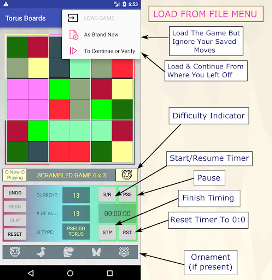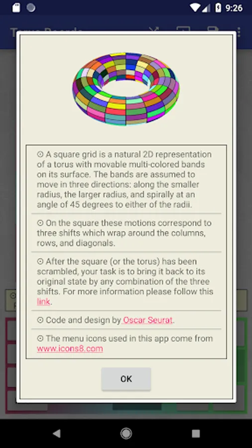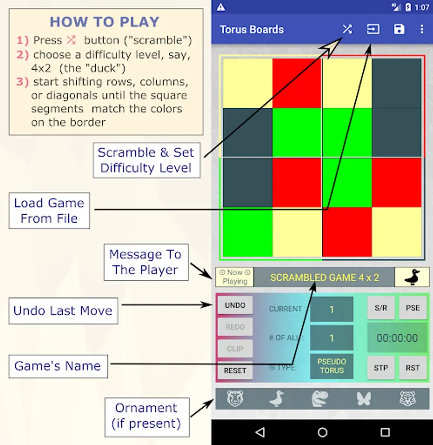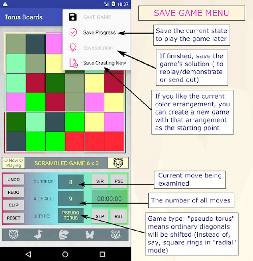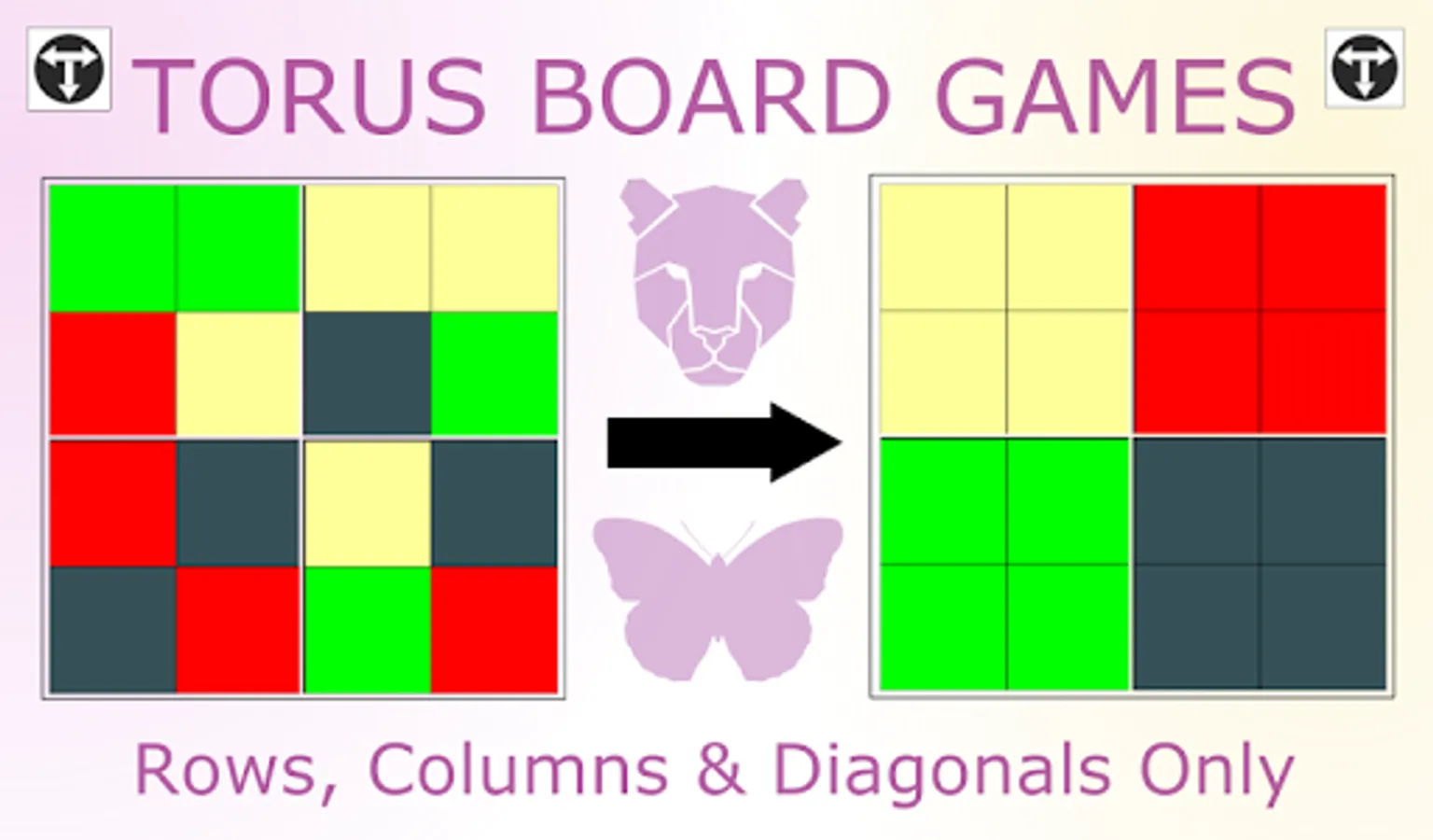 Torus Boards is a 2-dimensional representation of a game most naturally played on a torus with movable multi-colored bands on its surface (please see the animation at http://oscarseurat.com/TorusBoards/Torus4.html). The bands are assumed to move in three directions: along the smaller radius, the larger radius, and spirally at an angle of 45 degrees to either of the radii.