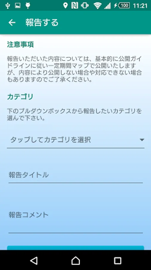 アプリからカテゴリーを選択して写真と位置情報で、直接担当課に報告することができます。