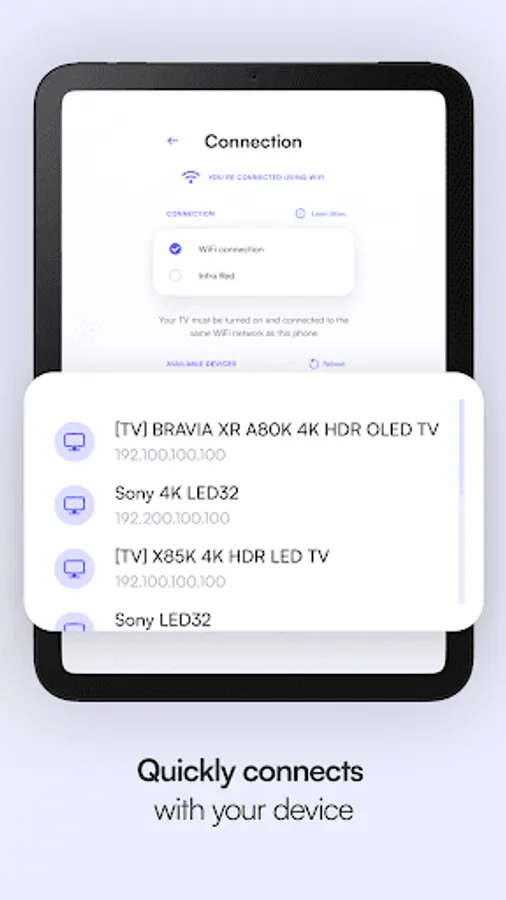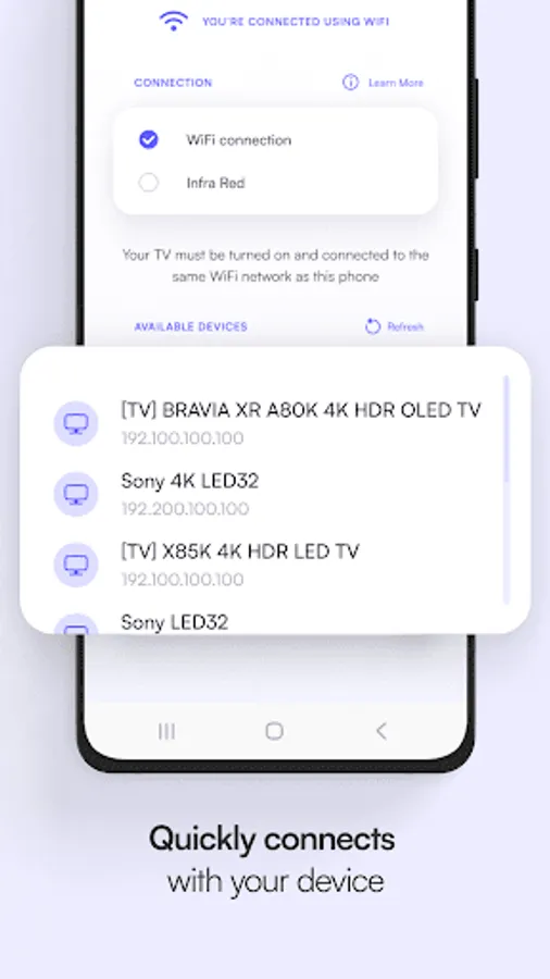 ✔ Use the Discovery section to view the list of available Sony Bravia, Sony Google TV and Sony Android TVs that are connected to the same network as your Android device.