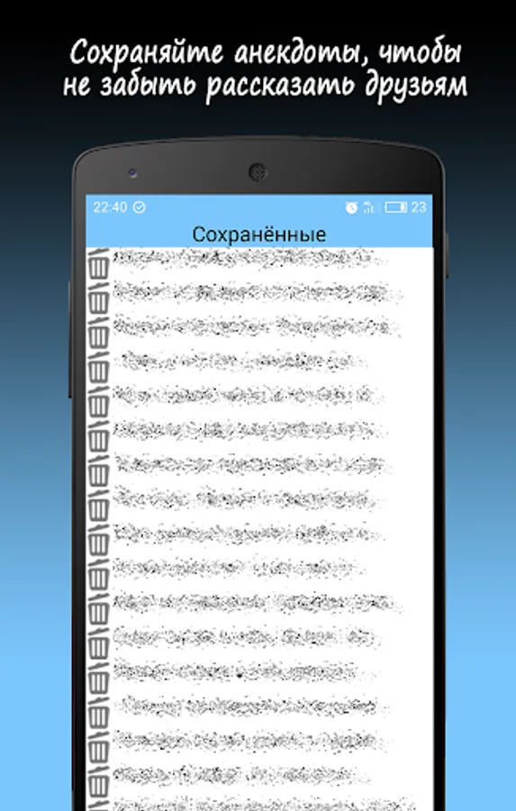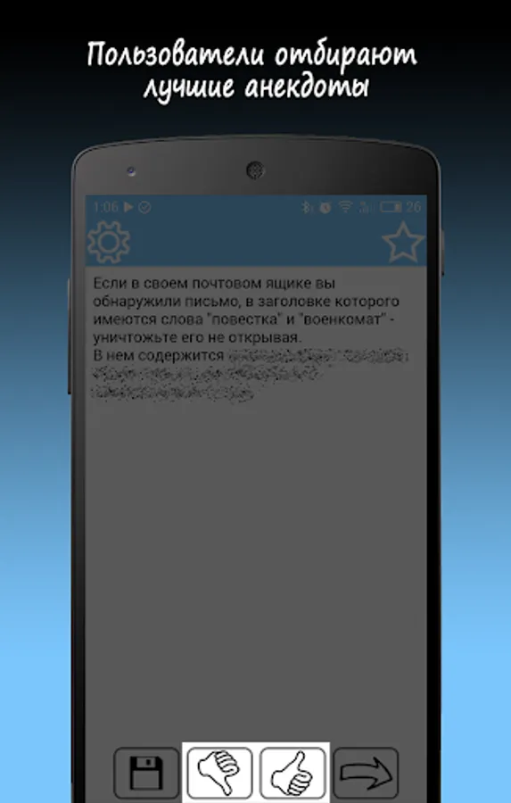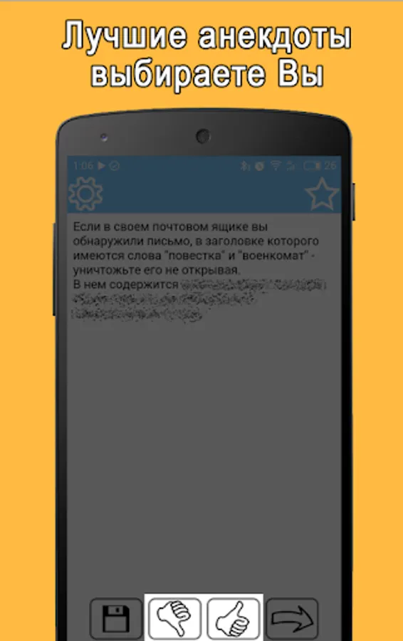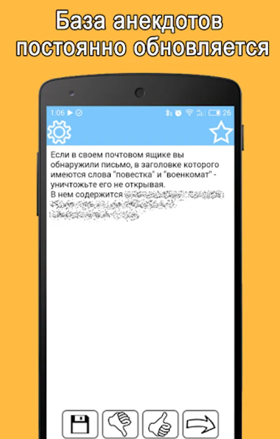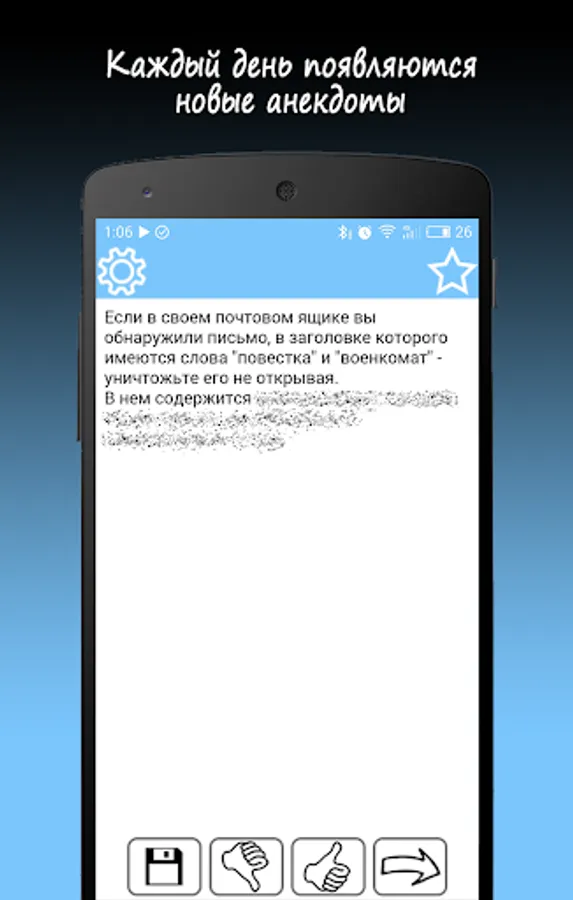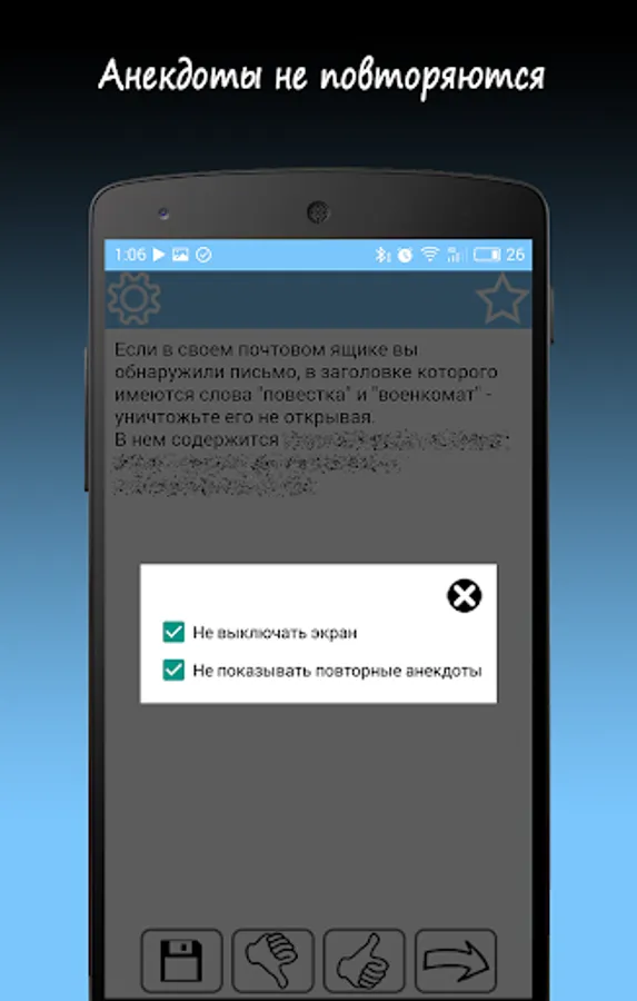 In the boring hour, a large base of jokes in your pocket will make you laugh and cheer you up. No categories, just open the application and in a random order on the screen appears anecdote. Read - flipping through.