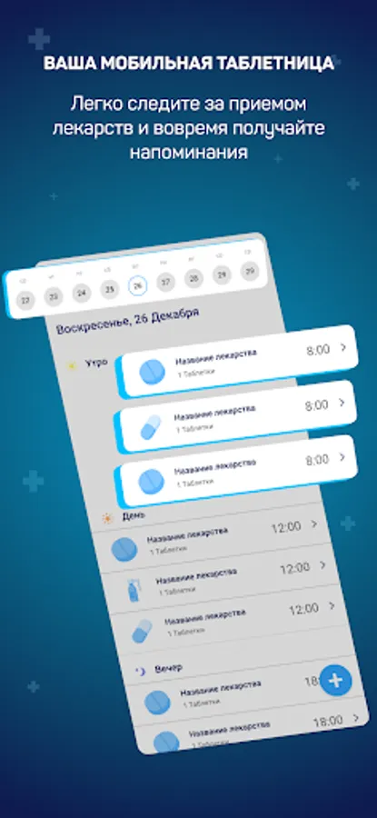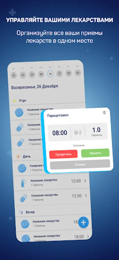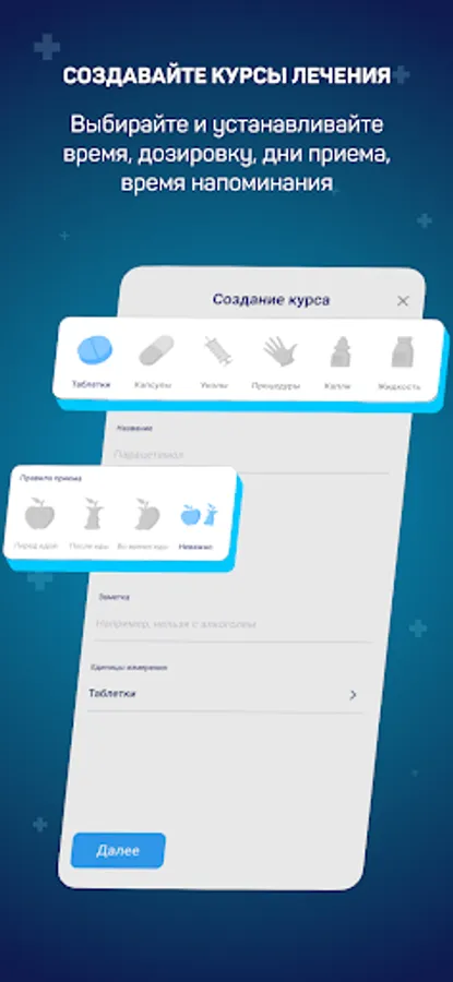 Create courses of treatment: set the dosage, days of taking medications and procedures. Keep track of all your treatments and receive notifications on time.