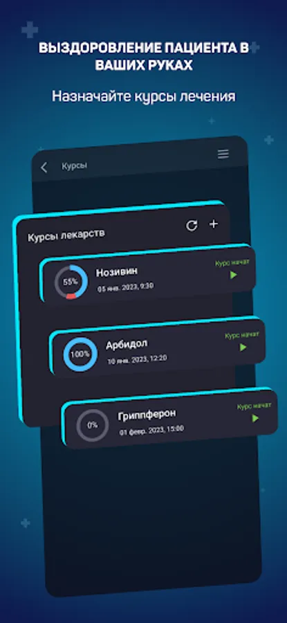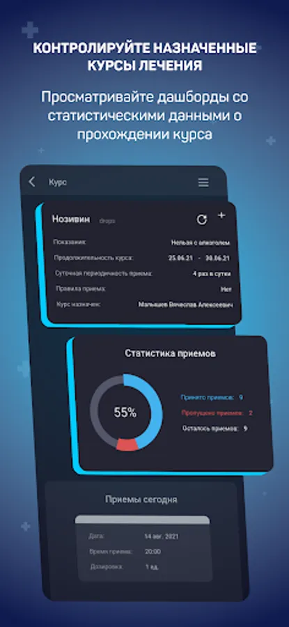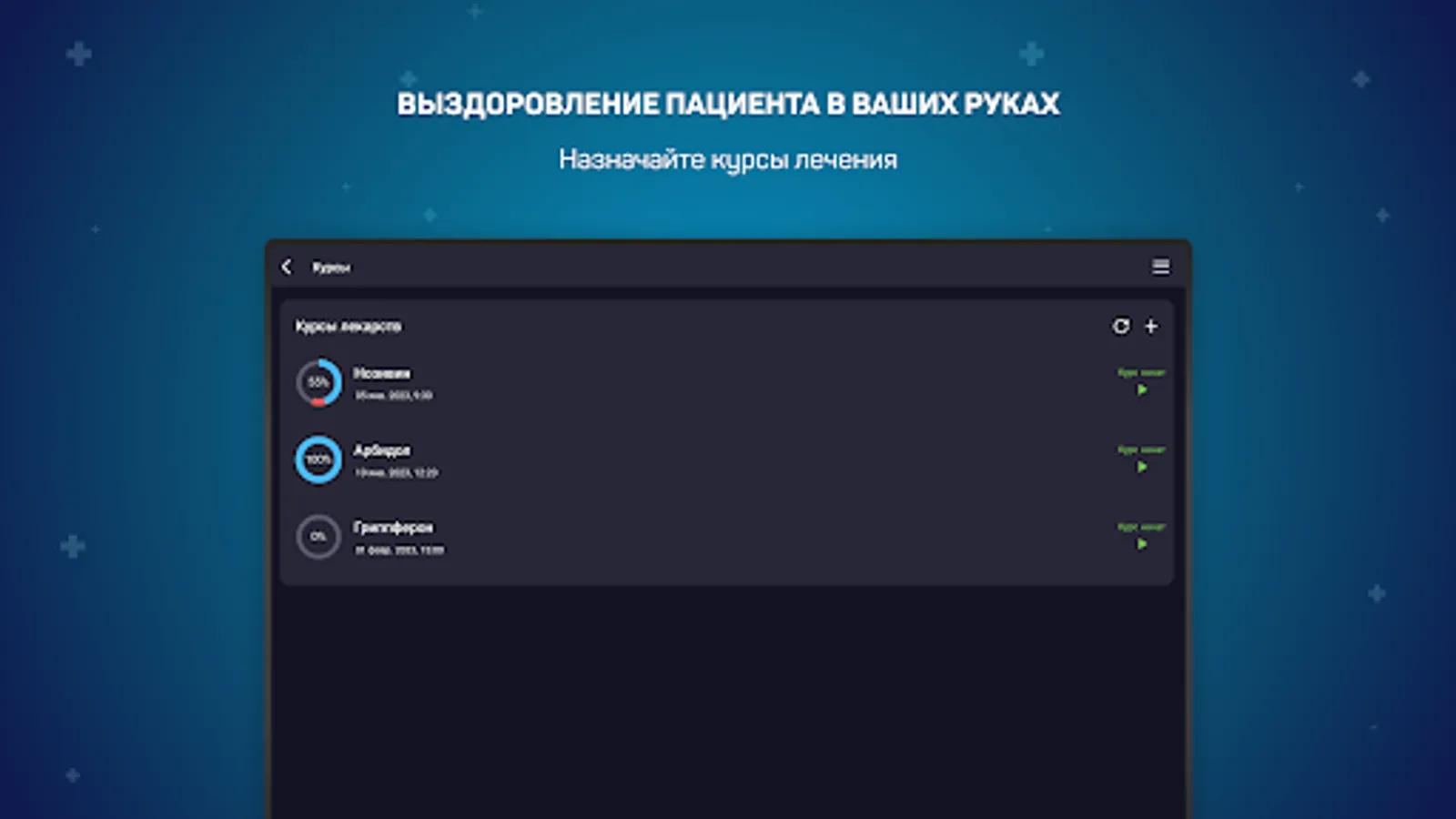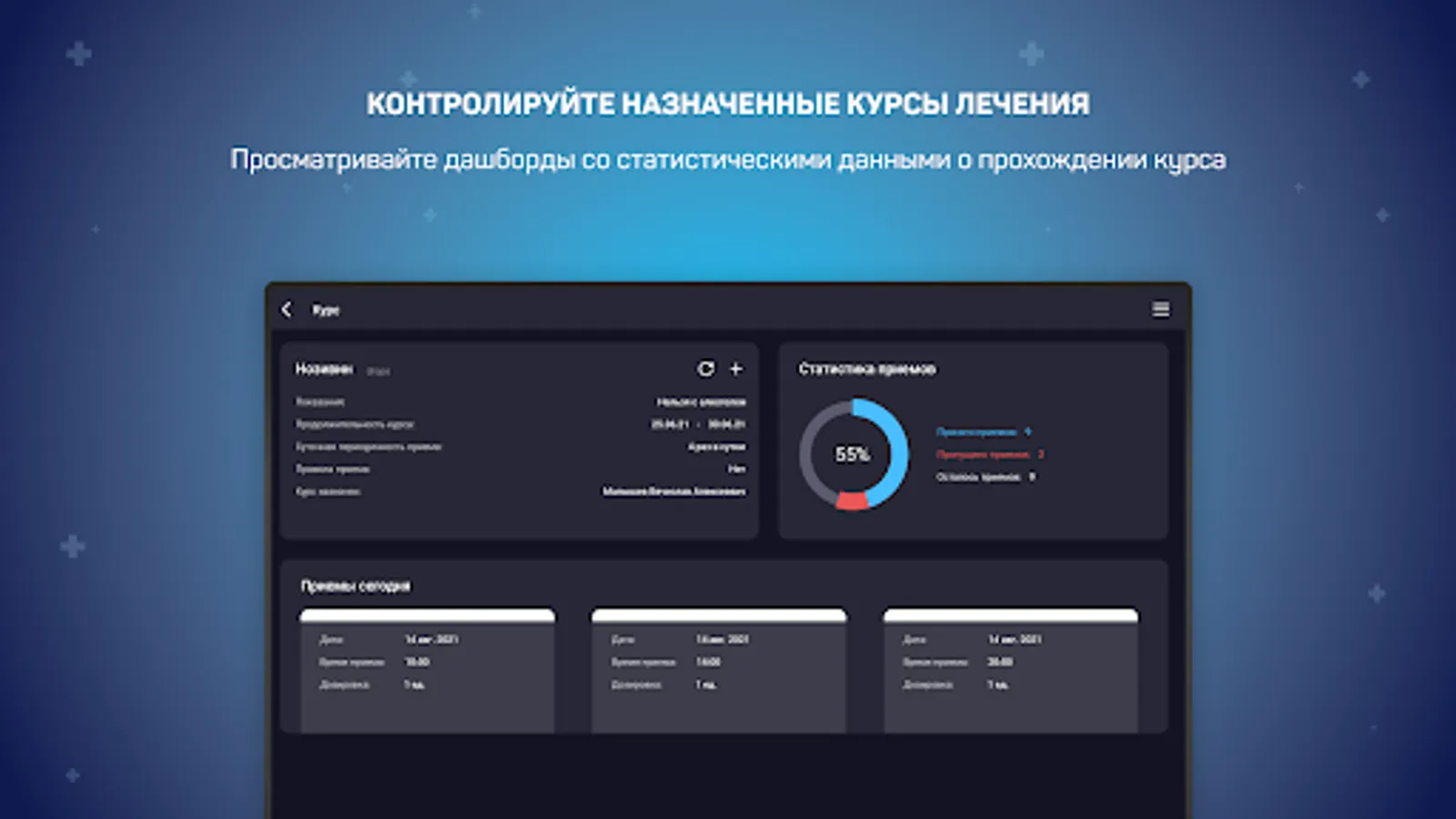 Give the patient courses of treatment (drugs or procedures). Set all the details of the course: time, number of doses, dosage. Monitor patient compliance with medications using dashboards with visualization of intakes.