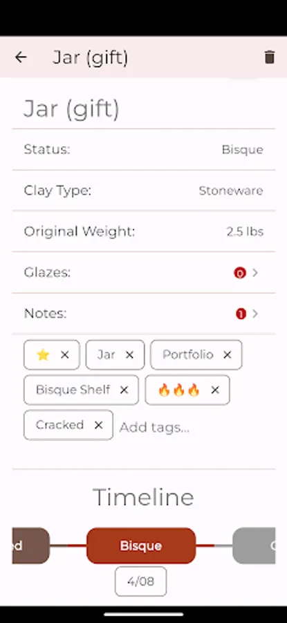 - Adding notes (by status or in-general), adding glazes, and adding tags