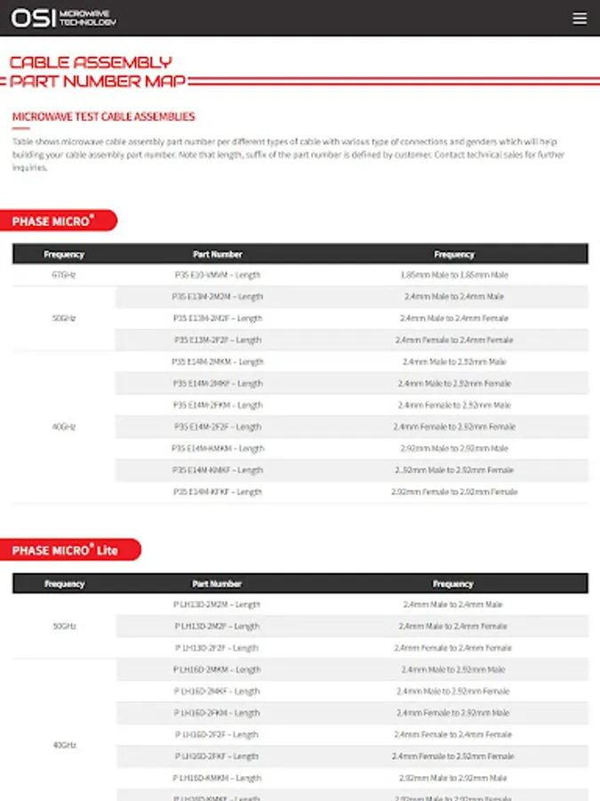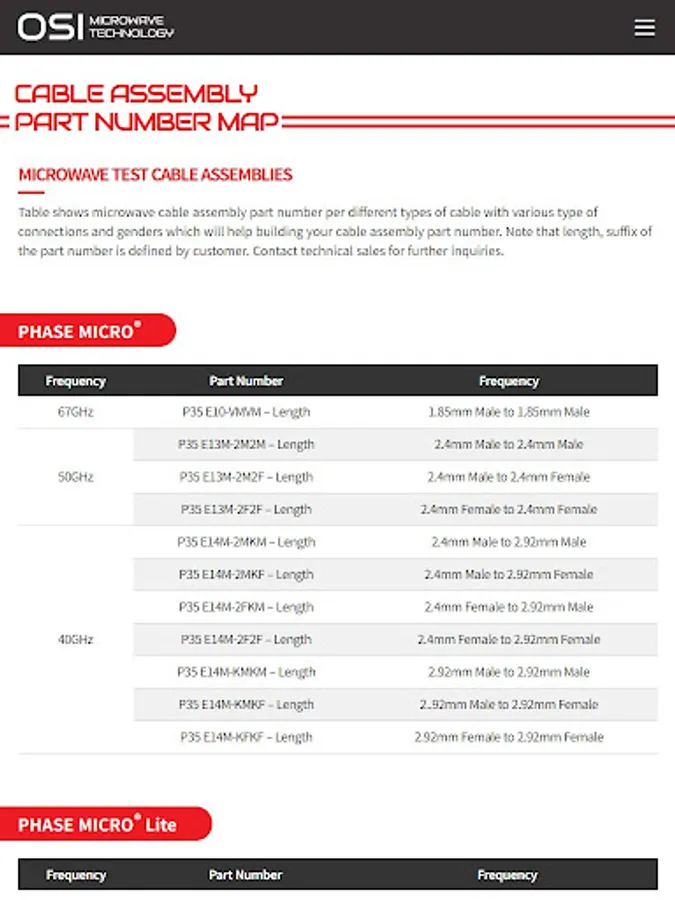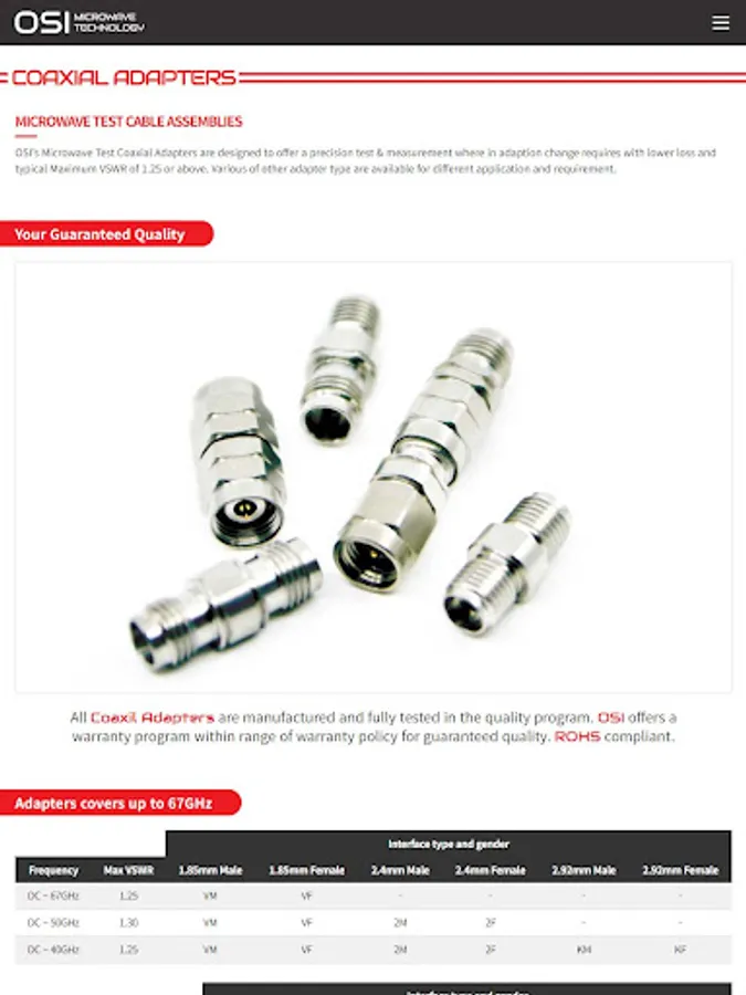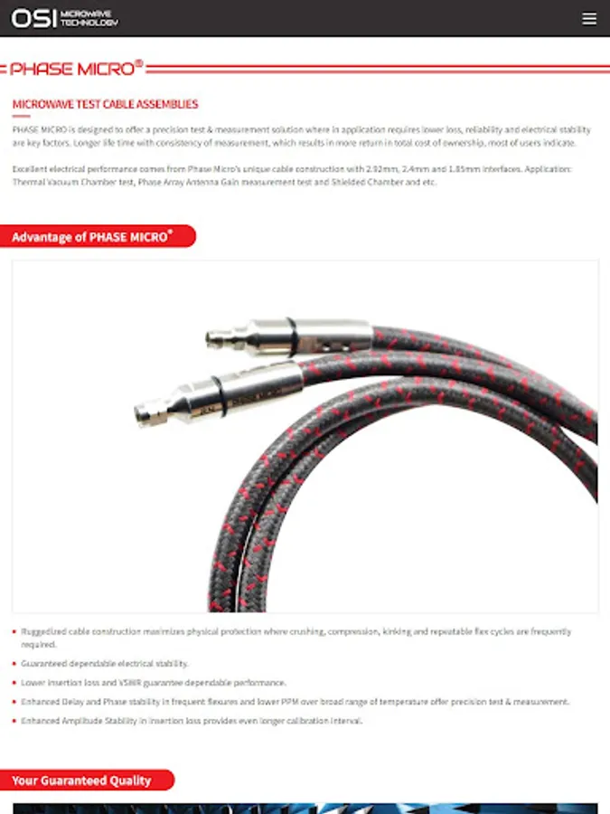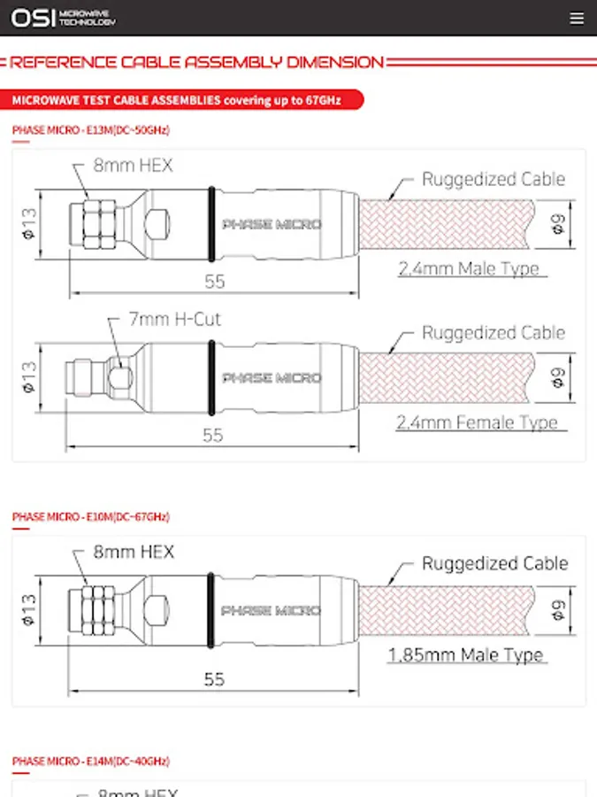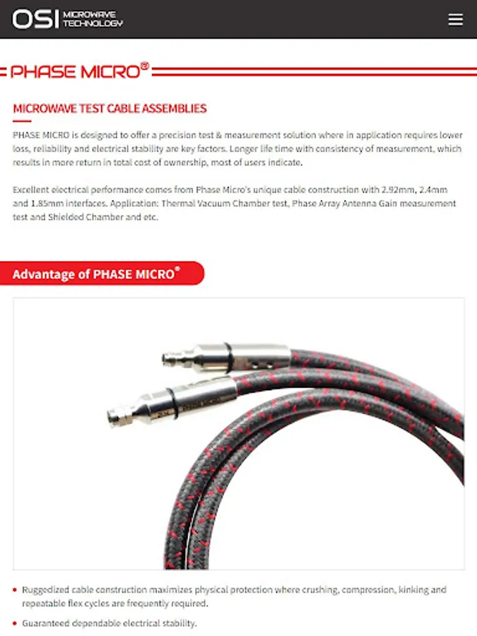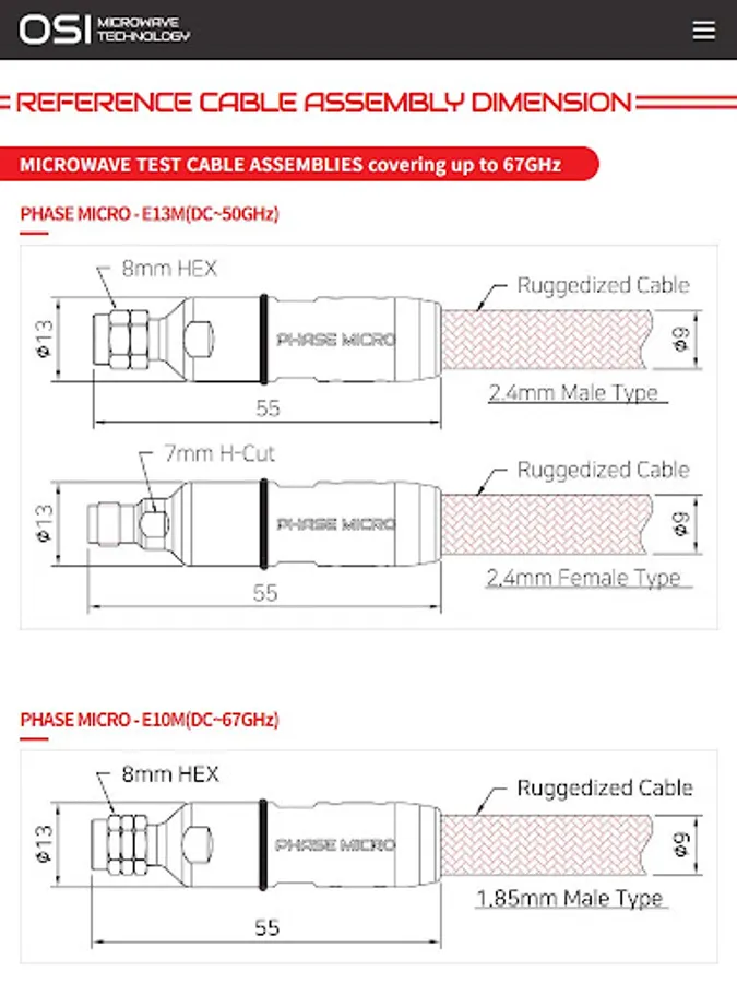 OSI의 마이크로웨이브 케이블 어셈블리와 동축 어댑터는 최대 50GHz를 커버할 수 있습니다. 전파 속도가 최대 83%인 OSI의 고유한 케이블 구성 설계는 연속 굴곡 및 온도 주기에서 환경 요인에 대해 낮은 감쇠, 위상 및 지연 안정성에서 우수한 전기적 성능을 제공합니다.