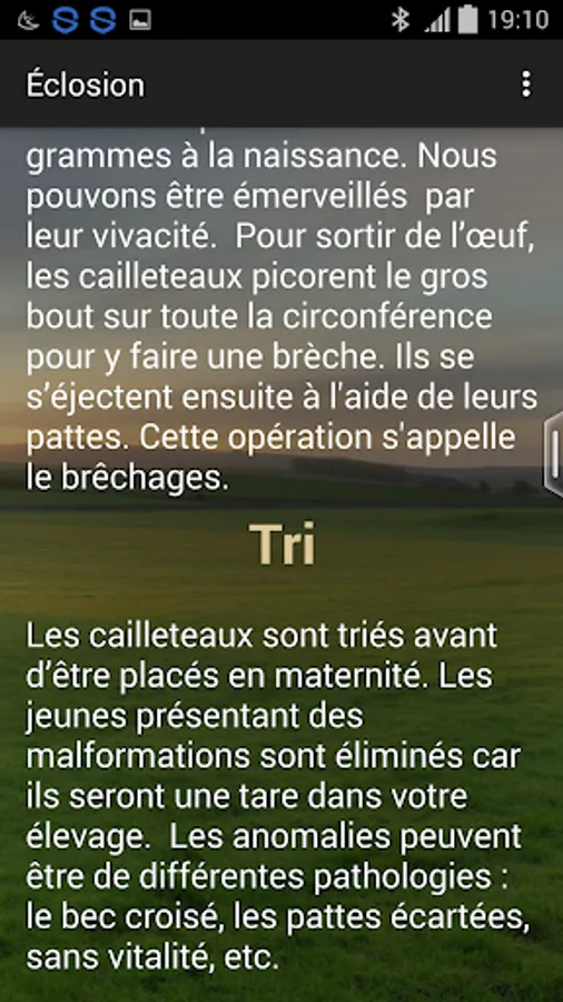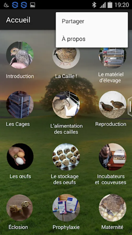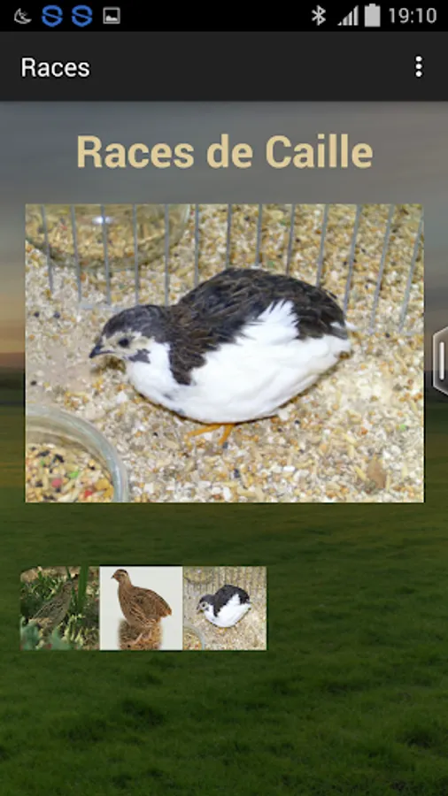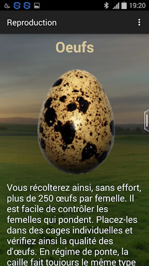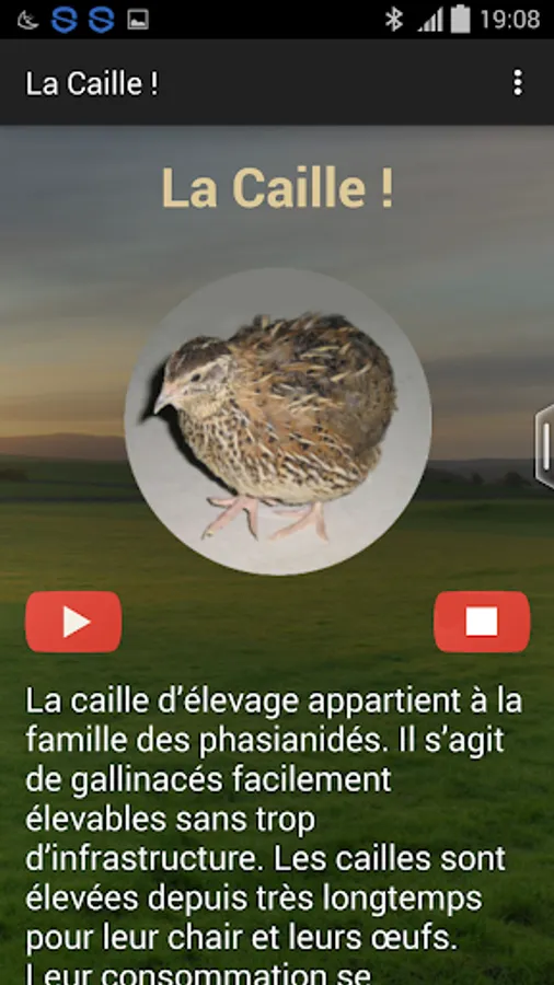 Quail rearing is a comprehensive guide that can allow a beginner to become a coturniculteur aguerri.En Quail rearing effect covers all aspects of the coturniculture (Husbandry Quail) such as breeds of quail, Food, prophylaxis, Cages, Livestock equipment , Mating Quail Ponte, storage and incubation of eggs, fattening, slaughter and sale of quail and many plus.Elle you can buy quail and equipment in Application.Élevage Caille also contains a library and a video library ( breeds quail, Eggs, Incubators, Maternity, animal husbandry equipment ...) .. and has a feature (pLAY STOP) that reads the text aloud (Practice for the lazy). I invite you to massively download this app to learn about the countless secrets of Quails.