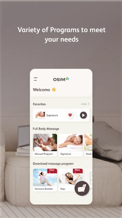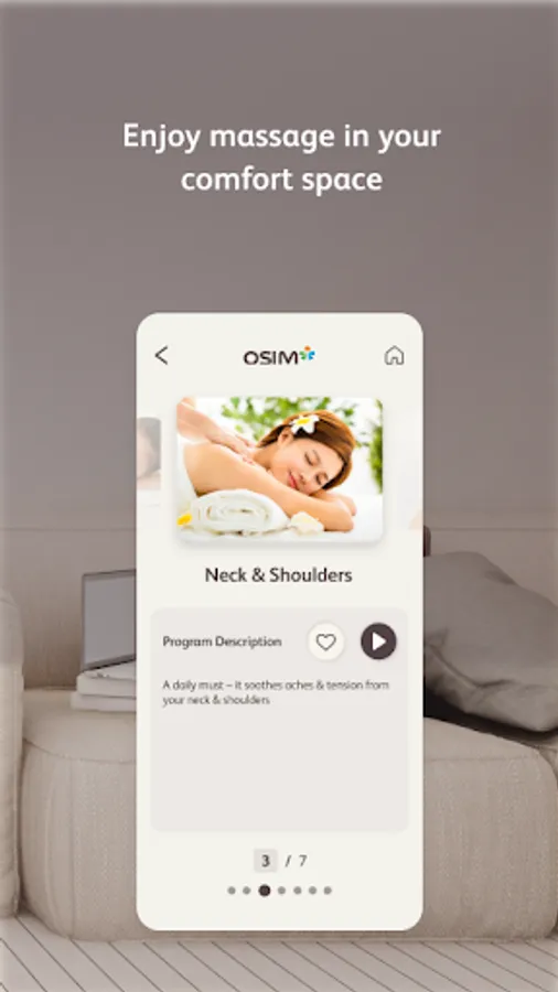 By leveraging on the advancement of smart devices and mobile app technology, this app pairs seamlessly with the OSIM uDiva 3 / 3 Plus Sofa. Offering full control, new download massage programs and relaxing music, a personalized massage is just at your fingertips.