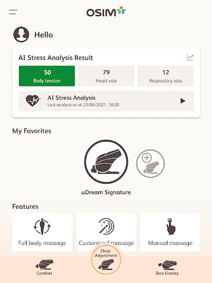 By leveraging the advancement of smart devices and mobile app technology, the uDream Pro app pairs seamlessly with OSIM uDream Pro Well-Being Chair, offering full chair control for a personalized 5-Senses well-being experience.