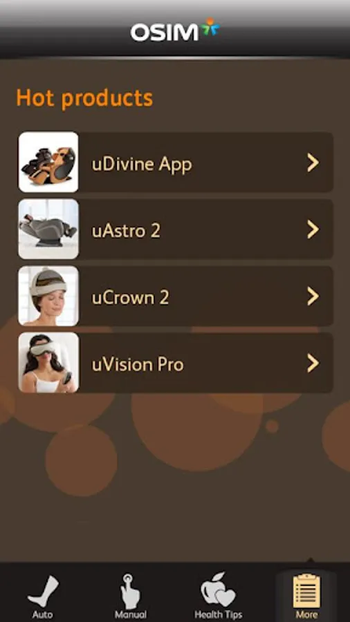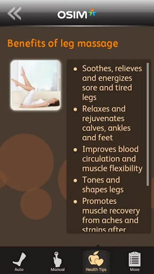 Extending the OSIM service and well-being to you, the uSqueez App provides smart recommendations, healthcare information and benefits of a good leg massage, helping you to optimize your massage experience.