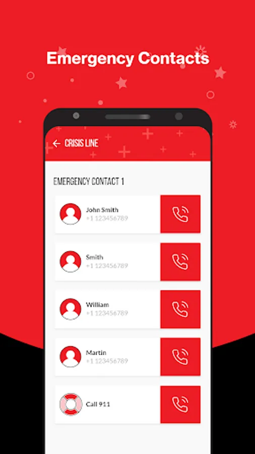 Quick access to 911, and crisis line for emergency support.