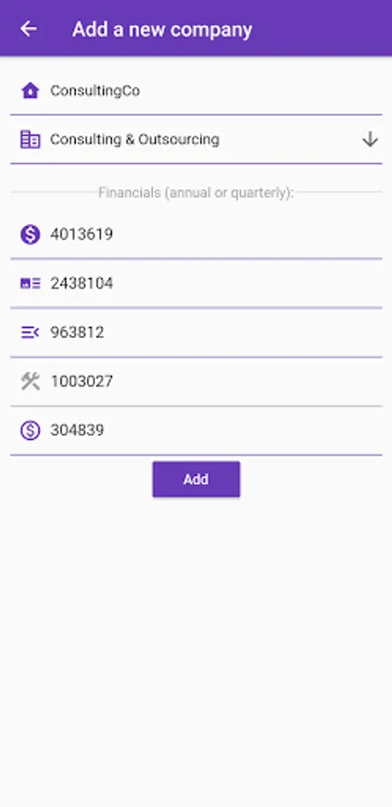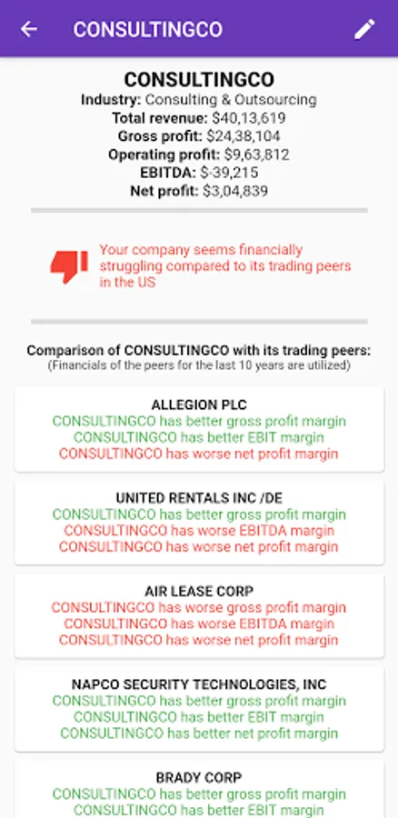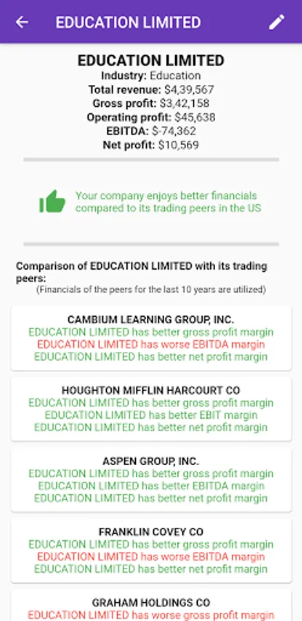 This app enables users to compare income statement of a company with its trading peers in the US. Users can add unlimited number of companies with their basic income data (revenue, EBIT, EBITDA etc.) through which the app will apply a sophisticated classification algorithm to detect the true position of the company with respect to its peers.