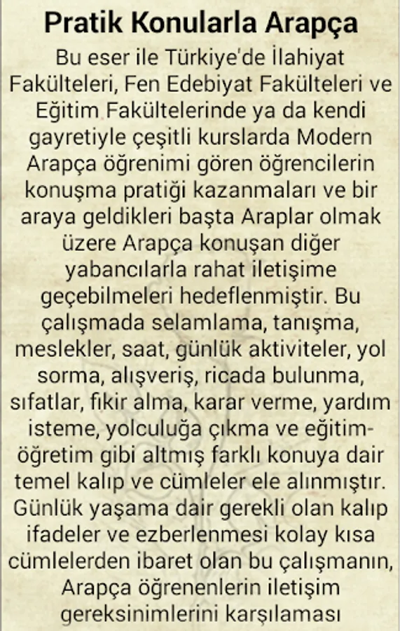 This work with the Faculty of Theology in Turkey is aimed may contact comfortable Arabic speaking to other foreigners, including Faculty of Arts and Faculty of Education at or gain practical speech of students of modern Arabic studies in various courses through its own efforts and in particular they met Arabs. In this study, greeting, meeting, occupation, time, daily activities, ways to ask, shopping, have petitioned, adjectives, get ideas, make decisions, to ask for help, basic phrases and sentences about sixty different topics such as going on a trip and education were discussed. Daily life is about expression and pattern memorization required of this study, which consists of an easy short sentence, hoping to meet the communication needs of learners Arabic ...
