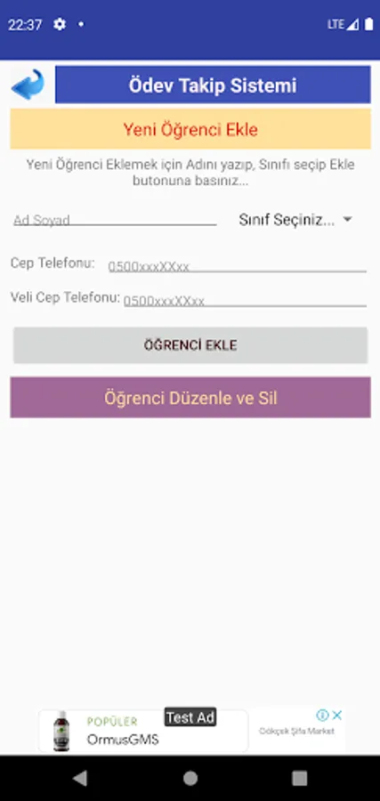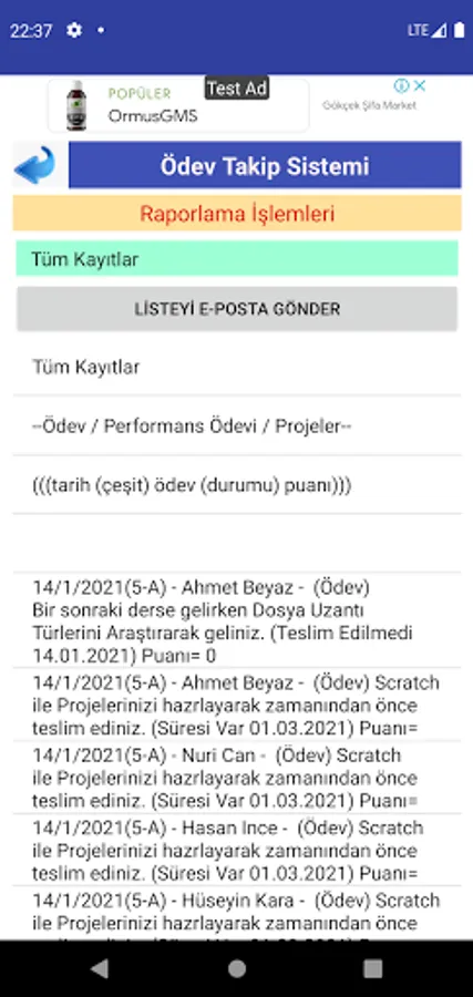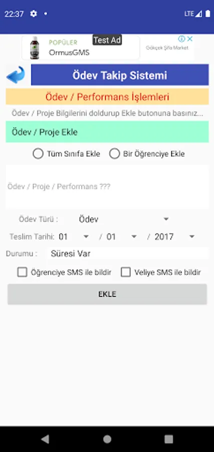 Project Tracking System with students' homework, homework performance, homework and class projects can be recorded and you can track their behavior. You can also send an SMS to the task when you add your students and their parents.