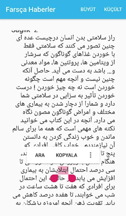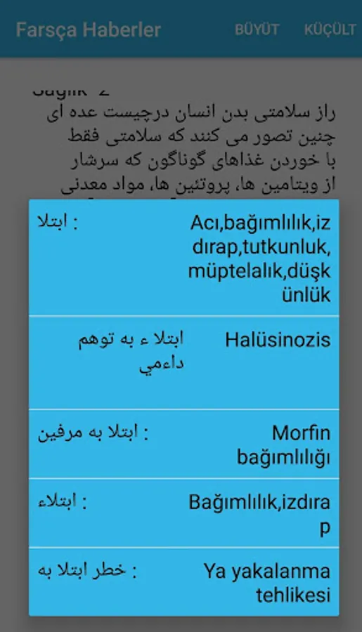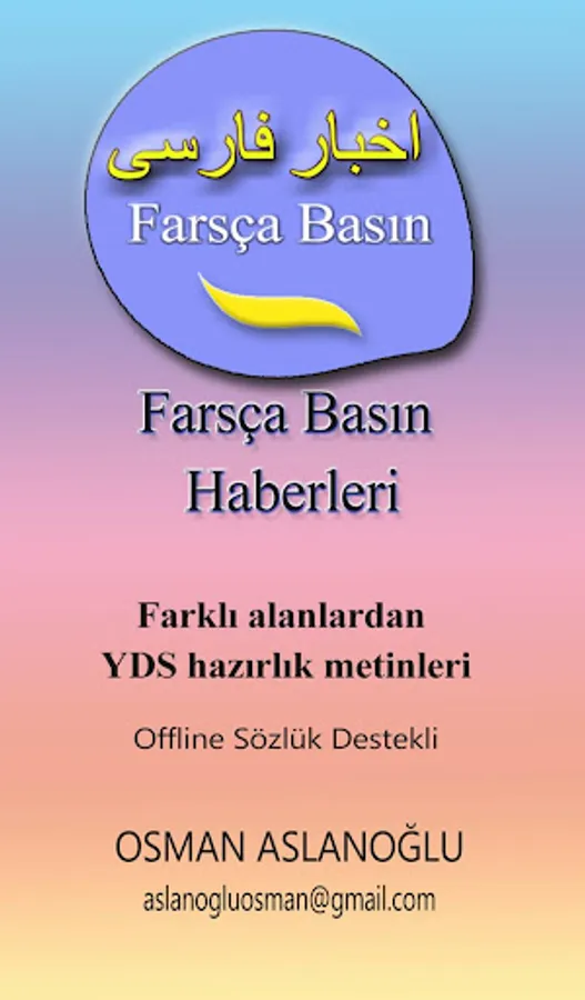 There are 23 texts in Persian press which are prepared for people in Persian and middle level. Their distribution as subject: 1 technology, 5 sports, 3 politics, 5 health, 4 general cultures and 5 economies. Those who want to develop Persian and Persian YDS exam can read these texts comfortably with the help of the dictionary without any time and space limit by opening the program everywhere.