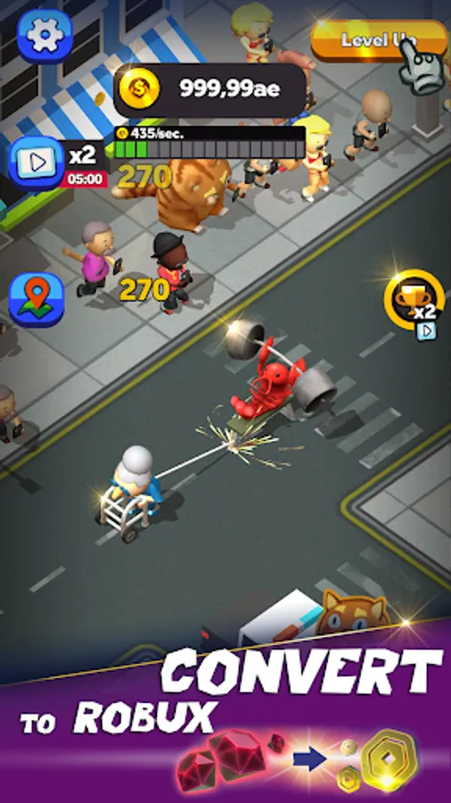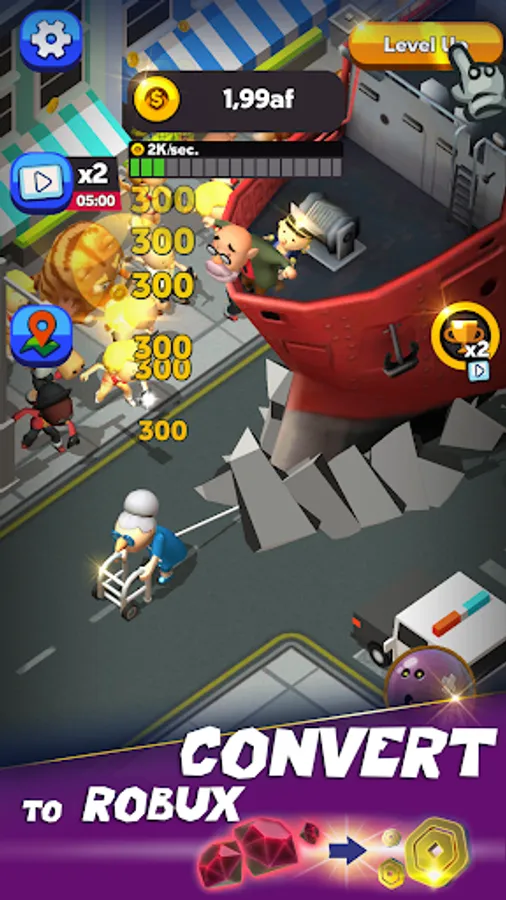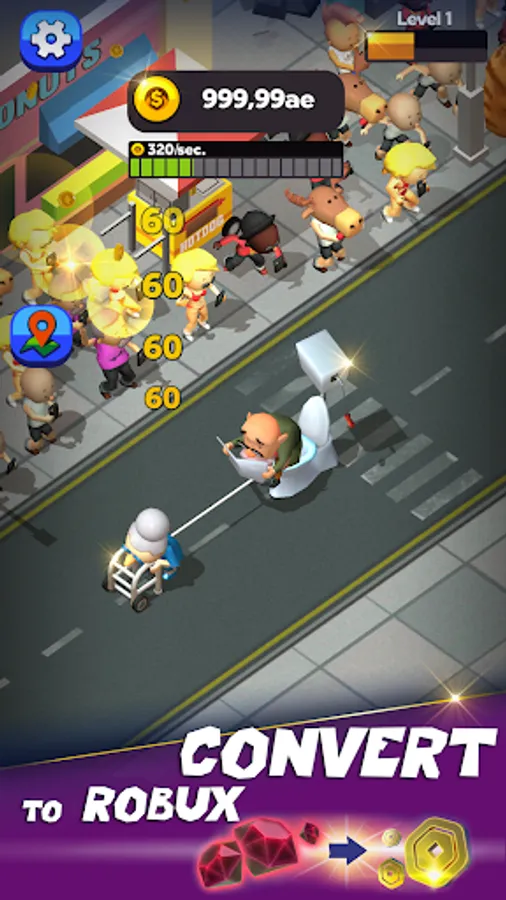 From the beginning of the journey, Mighty strong granny is barely crawling, but her efforts do not go unnoticed — the grandma attracts a huge crowd of fans willing to throw money. With more money, strong granny can upgrade her strength to speed up from walking to running or even flying!