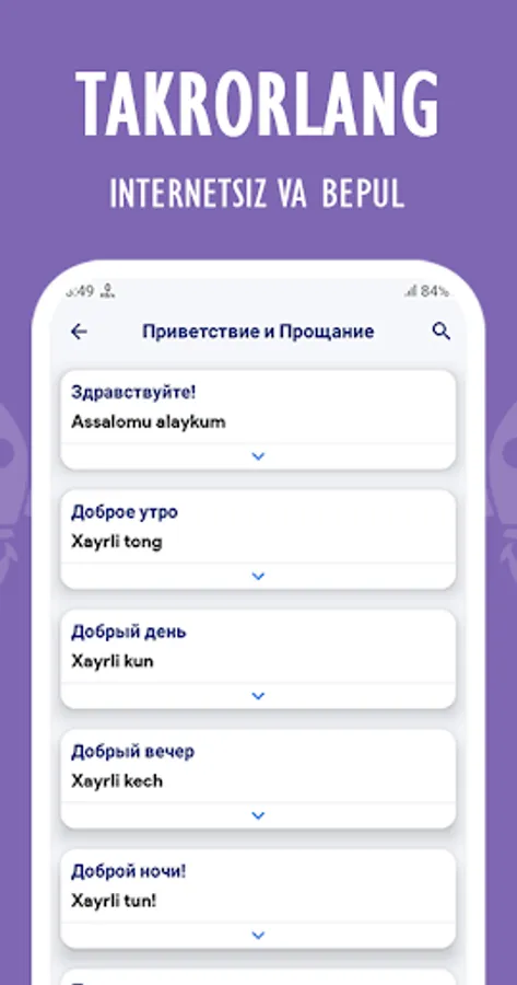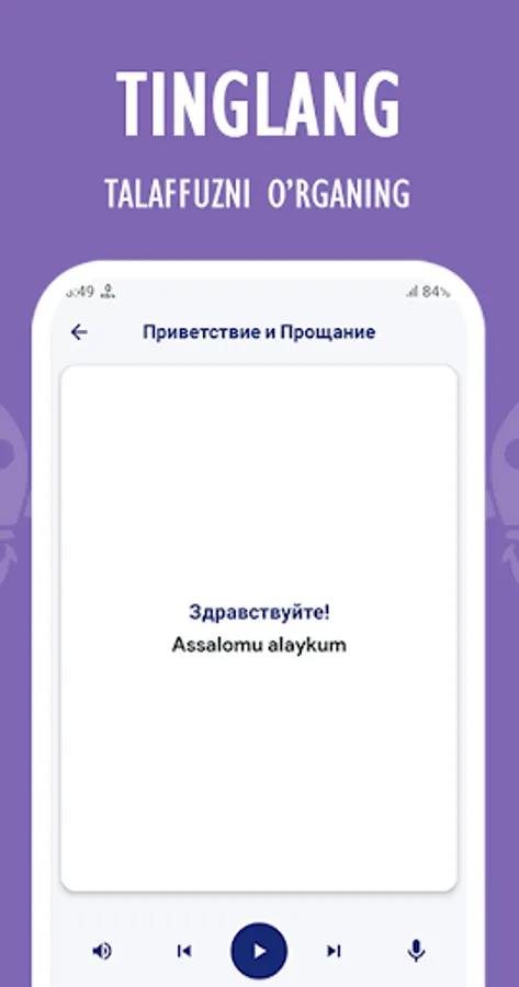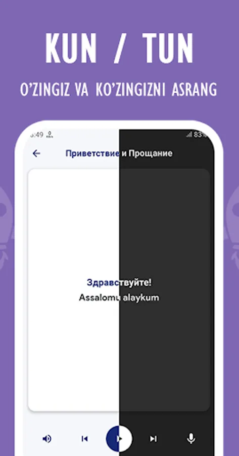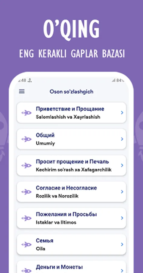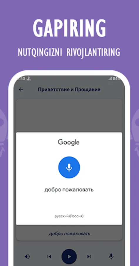 Rus va O'zbek tilidagi fraza gaplarning tarjimasini ko'rishingiz, talaffuzini tinglashingiz, gapirgan holda o'z nutqingizni rivojlantirishingiz mumkin!