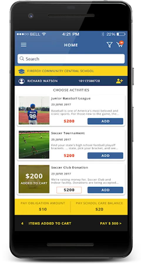 The system allows for school bookkeepers to easily set up school activities, events and other activity fund items online for purchase from within a web interface. Parents then can go online, view these activities, add them to a shopping cart, check out and pay by using a credit card. After payment is made the system will automatically send an email receipt to the purchaser and a subsequent email is sent to the Teacher/Sponsor of the activity notifying them that a payment has been received for a student.