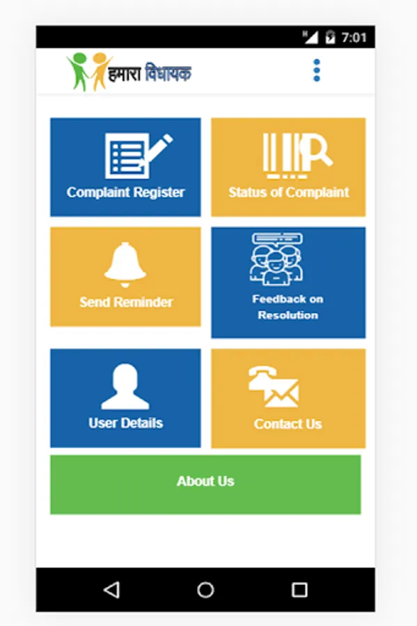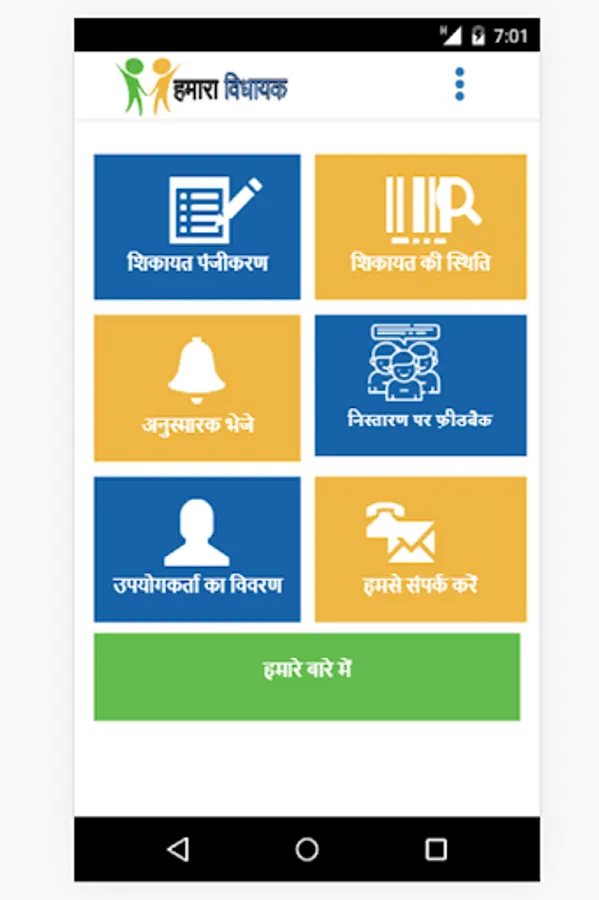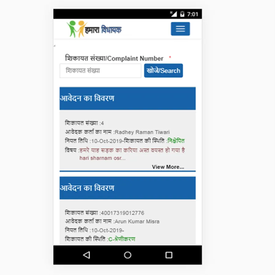 Hamara Vidhayak Apps janmanas se sedhe sanvad ke liye banaya gaya hai, is apps ke madhyam se janmanas samaj se jude hui shikayat va sujhav ko hamare paas bhej sakte hai jis par iye gaye pratek karyavahi se unhe avgat karaya jayega. Aap apps par hi apne dwara bheje gaye shikayat ya shujhav ke isthiti ko dekh sakte hai