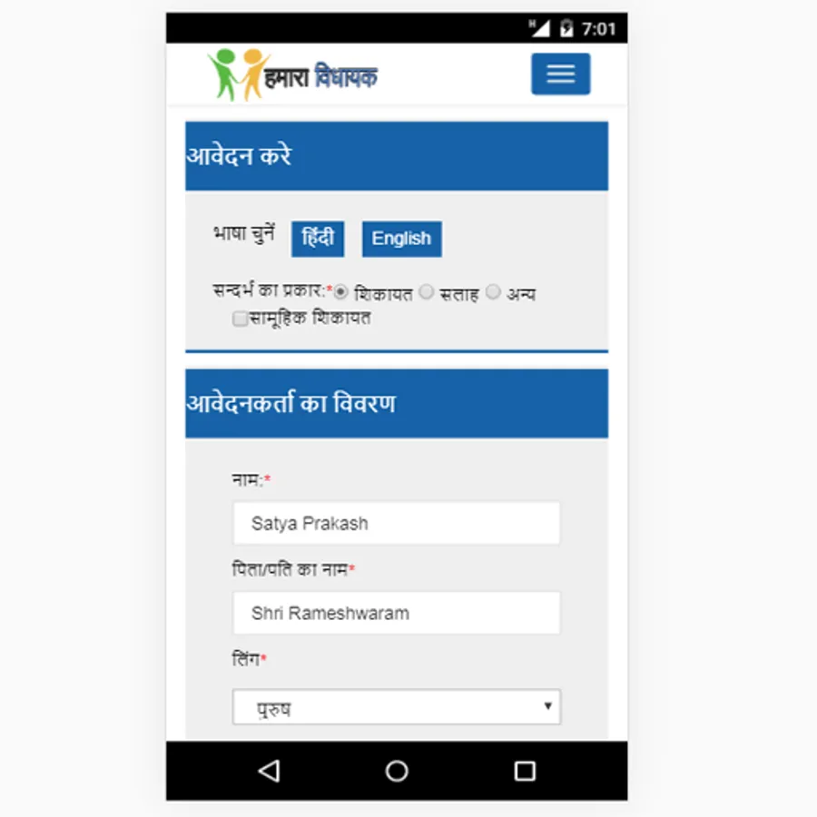हमारा विधायक एप्स जनमानस से सीधे संवाद के लिए बनाया गया है इस एप्स के माध्यम से जनमानस समाज से जुड़े हुए शिकायत व सुझाव को हमारे पास भेज सकते हैं जिस पर किए गए प्रत्येक कार्यवाही से उन्हें अवगत कराया जाएगा आप एप्स पर ही अपने द्वारा भेजे गए शिकायत या सुझाव के स्थिति को देख सकते हैं