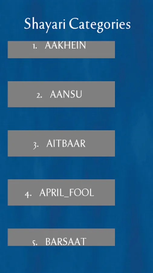 Sad, Dosti, Bewafa, Dua, Lovely, Inspire, Intezaar, Urdu, Sharabi, Arzoo, Yaad, Barish, Chahat, Dil, Ajnabi, Doorie, Ehsaas, Mausam, Christmas, New Year, Love, Dard, Funny, Hindi, Romantic.