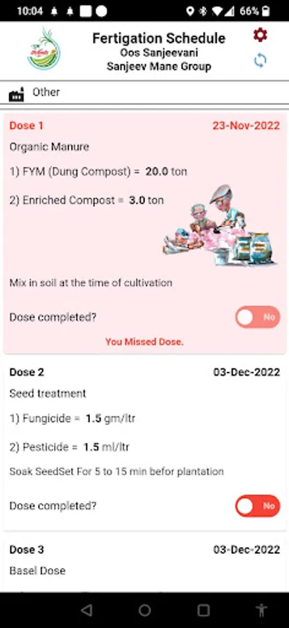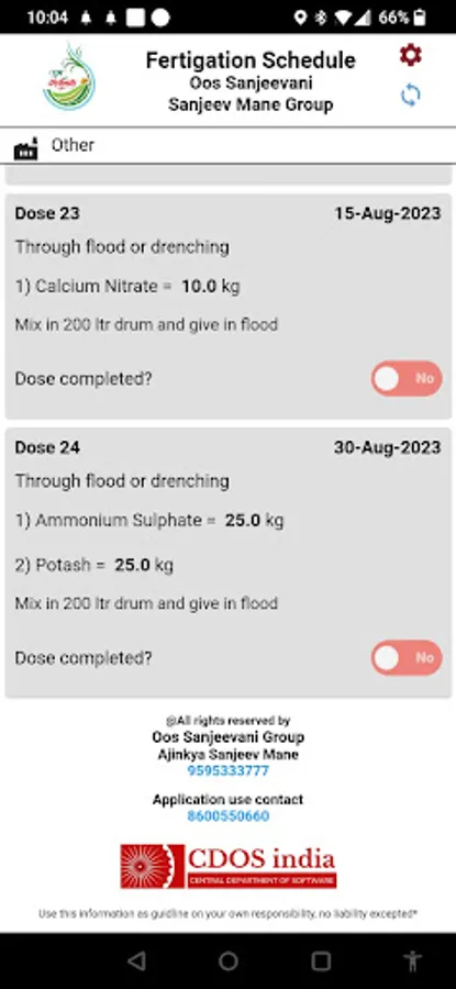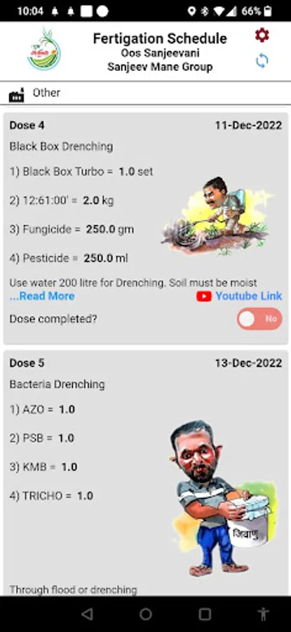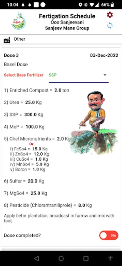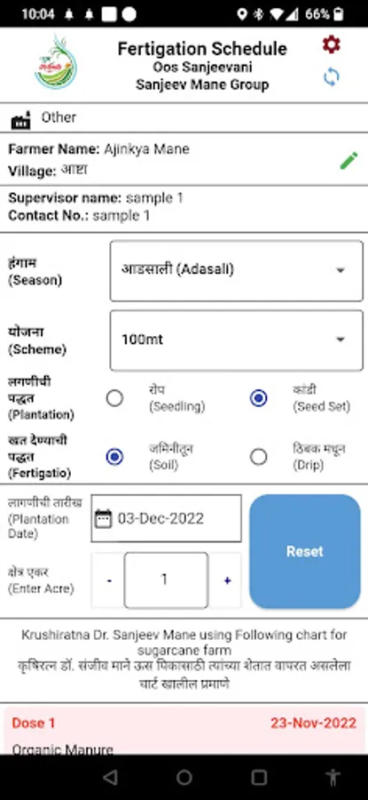 App shows fertigation schedule which Krushiratna Dr. Sanjeev Mane use in his own sugarcane farm (India, Maharashtra) to achieve targeted sugarcane yield from 1996, contains all combination as Plantation Season : Adasali / PreSeason / Season / Ratoon, Plantation Method : Seedling / Seedset, Fertigation Method Drip / Soil,