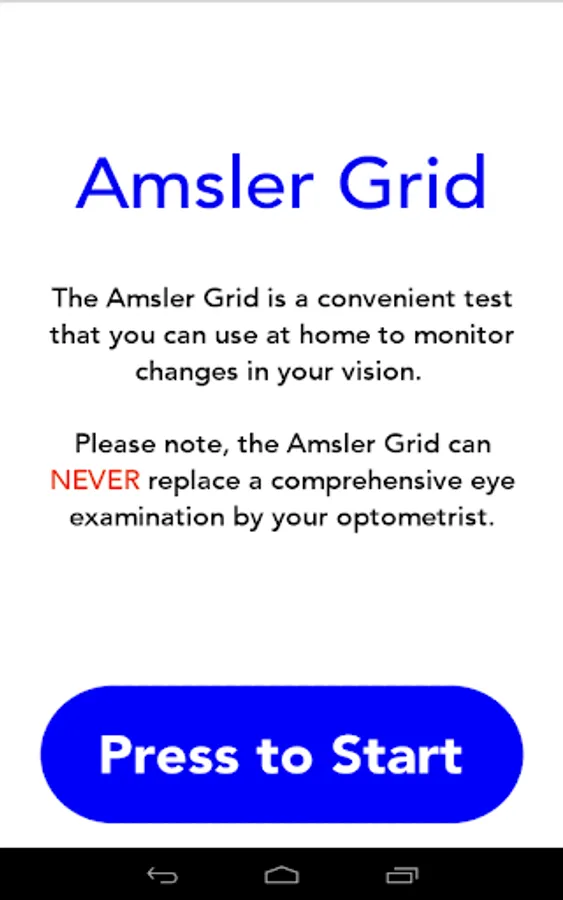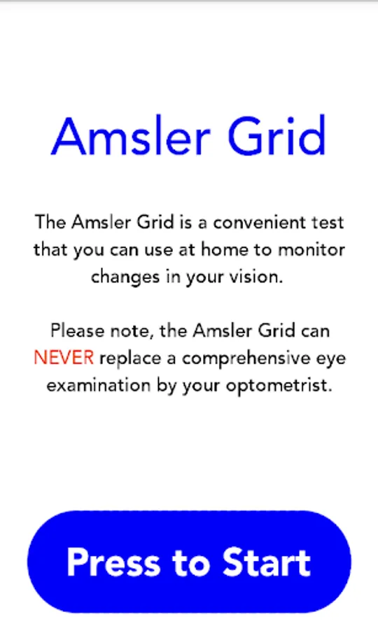 The Amsler Grid is a tool for identifying distortion in your visual field. It is a convenient eye test that you can use at home to monitor changes in your vision. It helps to detect many problems early, while they may still be treatable, such as retinal detachments and central serous choroidopathy. It is recommended that individuals with macular degeneration test their eyes with the Amsler Grid daily. If any changes are noted, you should contact your optometrist immediately. An Internet connection is not required to use this app. Your privacy is secure because our app does not require any special permissions and does not collect any information.