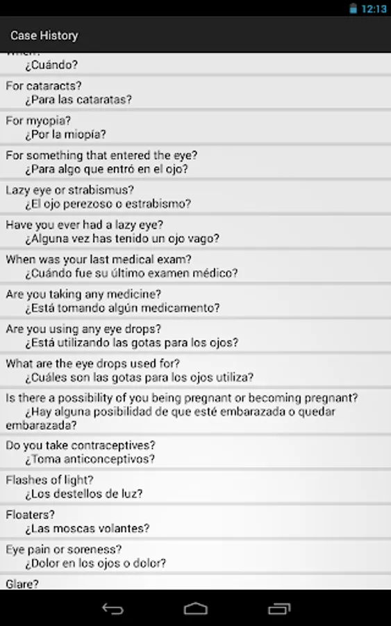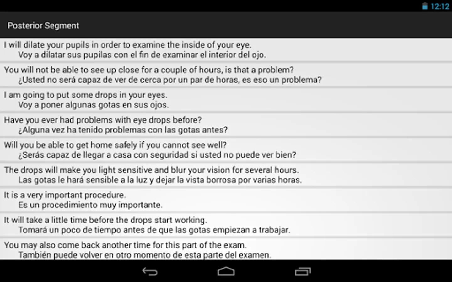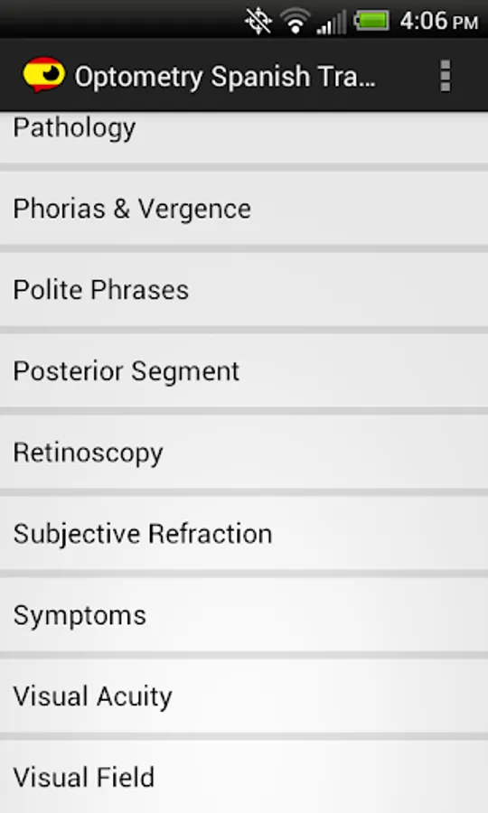 Optometry Translator Spanish for Android is a professional mobile translator for practitioners such as optometrists, ophthalmologists, medical doctors, optometric technicians, and other healthcare providers. This is simply the quickest method to communicate with Spanish speaking patients in an eye exam. Phrases are divided into intuitive categories for quick access to the right phrase at the right time. High quality recordings of all the necessary basic clinical instructions are now at your fingertips in one convenient location.